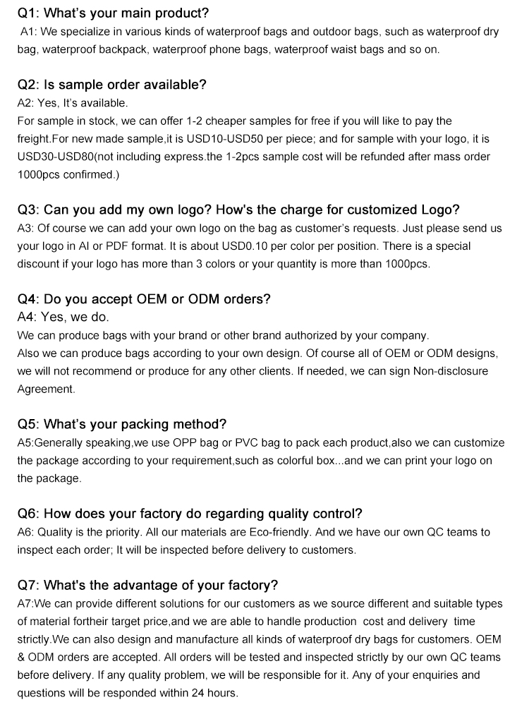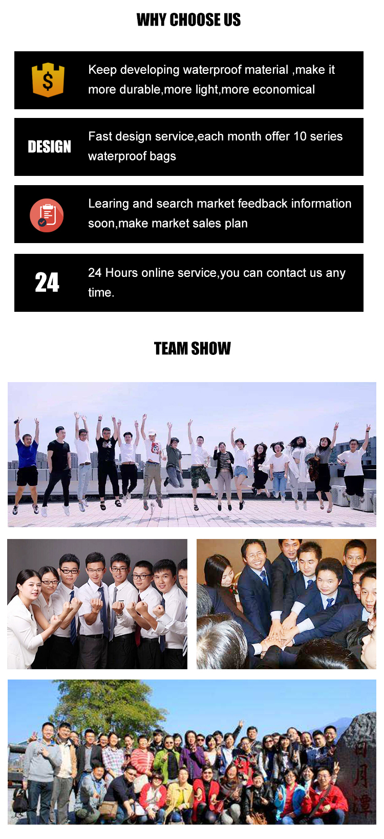 Dongguan Yatu Sports Goods Co., Ltd. is a manufacturer of outdoor sports waterproof products, mainly supplying outdoor waterproof bags. It was established in 2008 and has a professional design and development team, advanced production equipment, mature production technology and superb production and sales. Team, strictly we own two brands "Reboinc" and "YATU", our goal is to become the leading brand of outdoor waterproof bags and other outdoor sports products. We are committed to advocating the concept of "enjoy life, enjoy sports" and will create a better future. The products and services we provide you rely on many years of outdoor product OEM experience, and strive to meet the discerning needs of sports enthusiasts with high cost performance. The company currently has advanced machinery and equipment, strong technical research and development capabilities, and specializes in the production of various PVC, TPU waterproof bags, safety swimming cloths, waterproof luggage bags, and outdoor waterproof solutions. We continue to innovate and actively develop new products to be as close as possible to consumer needs.