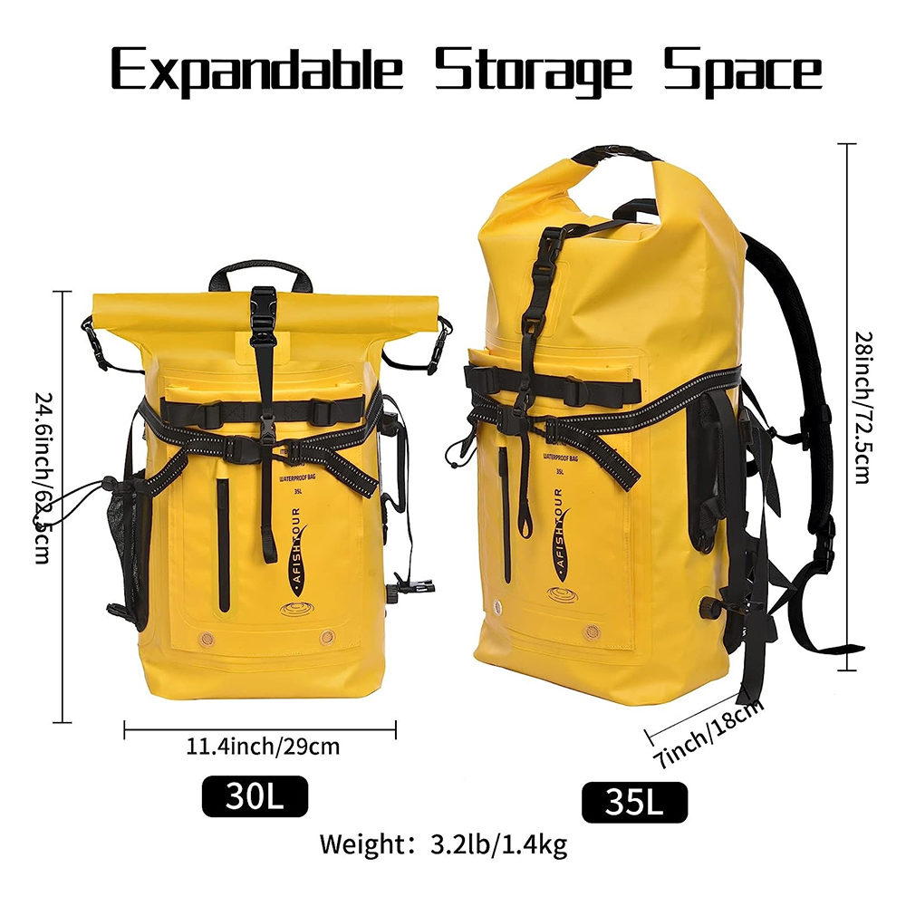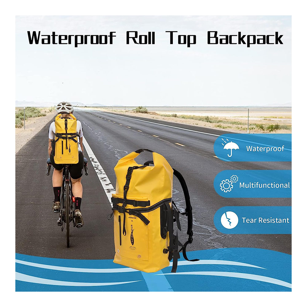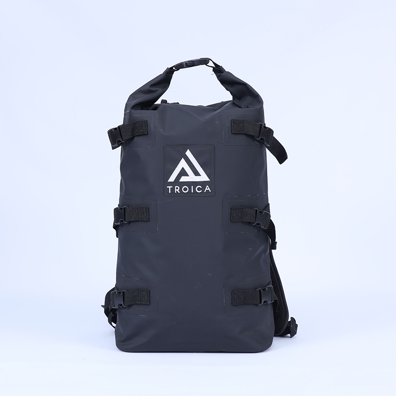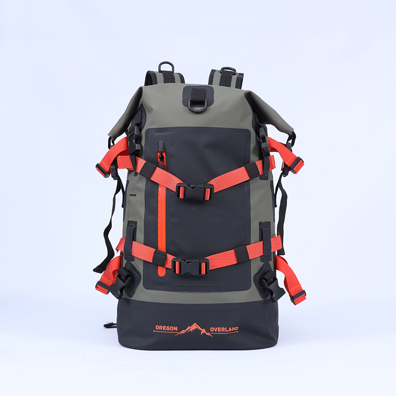 * 100% weatherproof, snow, sand, mud and dust High frequency welded 1680D TPU laminated ripstop oxford with roll down zipper system + 8 compression straps to create an airtight dry bag