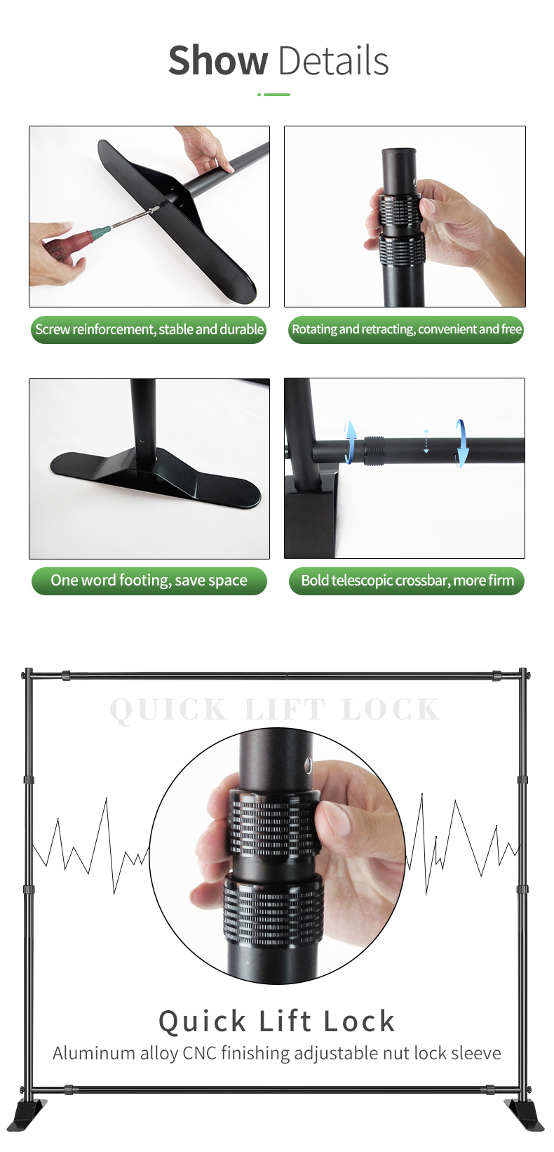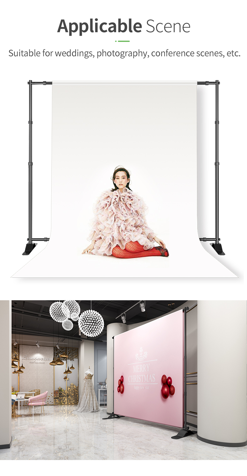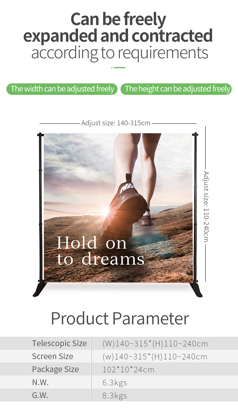 It uses a simple structure to produce a large-sized screen. This type of stand is becoming more and more popular because of its simplicity, stability, and flexibility. The frame width can be adjusted to 147-315 cm and the height can be adjusted to 107-247 cm. Seamless fabric printing adopts advanced printing technology, which solves the problem of printing small batches of fabrics, enhances applicability, and can be attached to standard frames and curved graphics. The flat cloth surface makes the display effect more perfect and solid. It is often used as a back wall for trade shows or projection screens, indoors and outdoors, etc. Its simple installation method and packaging bring great convenience.