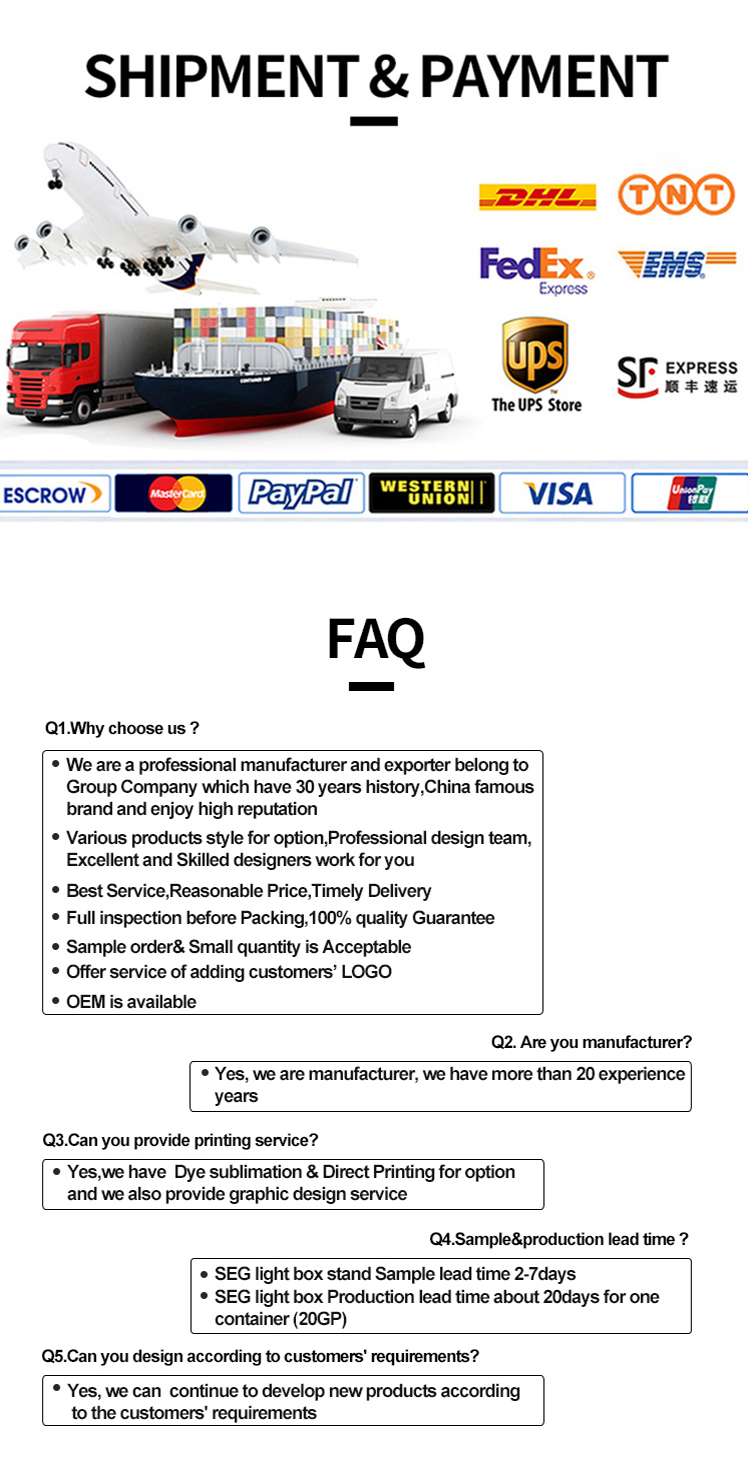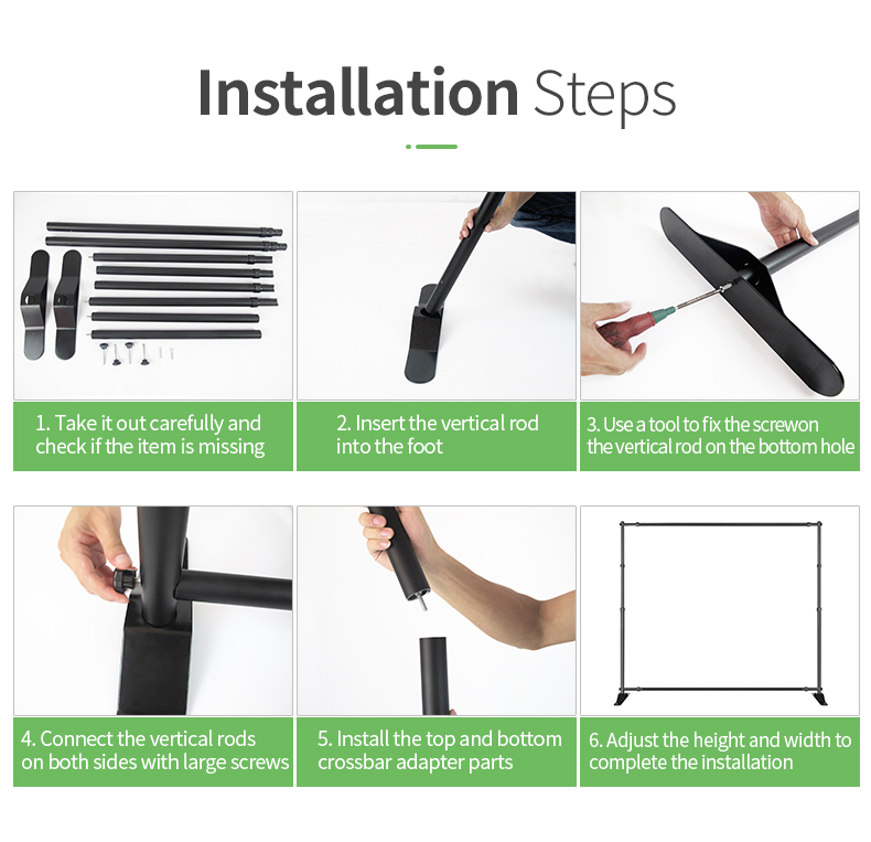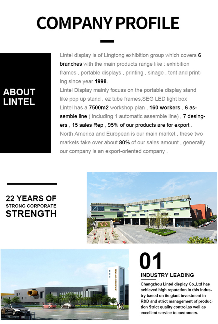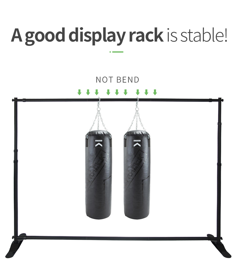 It uses a simple structure to produce a large-sized screen. This type of stand is becoming more and more popular because of its simplicity, stability, and flexibility. The frame width can be adjusted to 147-315 cm and the height can be adjusted to 107-247 cm. Seamless fabric printing adopts advanced printing technology, which solves the problem of printing small batches of fabrics, enhances applicability, and can be attached to standard frames and curved graphics. The flat cloth surface makes the display effect more perfect and solid. It is often used as a back wall for trade shows or projection screens, indoors and outdoors, etc. Its simple installation method and packaging bring great convenience.