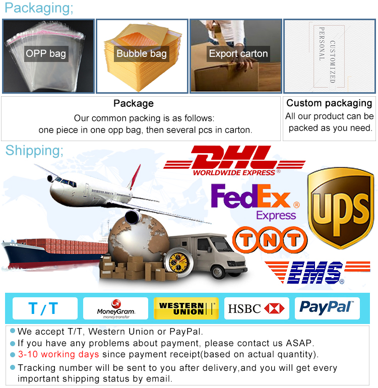 Paypal, Western Union, Bank, T/T, Aliexpress and Trade Assurance are welcome.