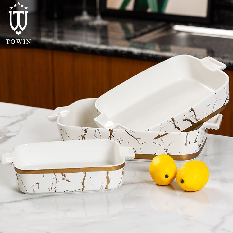Custom Wholesale Gold Marble Decorated Rectangular Porcelain Baking Pans