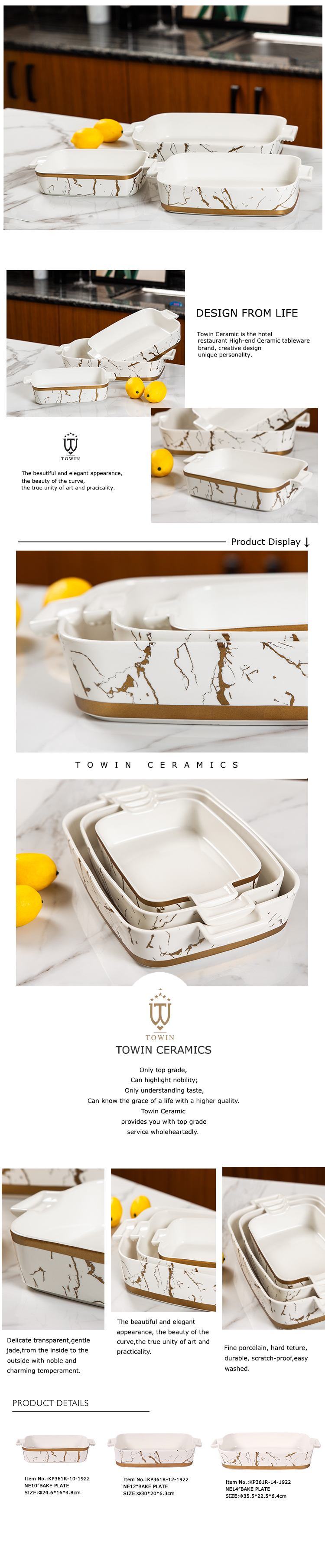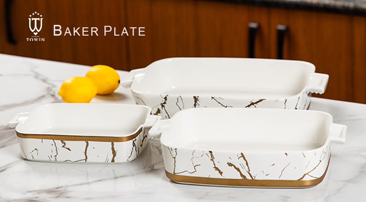 | Packaging Details: | Wholesale custom golden marble fancy rectangular kitchen porcelain baking tray brown box/color box/gift box | describe: | food contact safety |