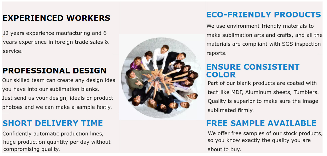 A: We are specialized in producing all kinds of Sublimation stuffs, such as Various MDF wall / Door hanger, Photo panels, Sublimation Jewelries(Necklace, Bracelet, Earrings), Aluminum board, Keychains, Notebooks & Notepad, Pillow cases, Blankets, Tote bag, Ladies' bag, Fashion backpacks, Shoulder bags, Cosmetic bags, Shopping bags, Wallets and other related products for worldwide customers.