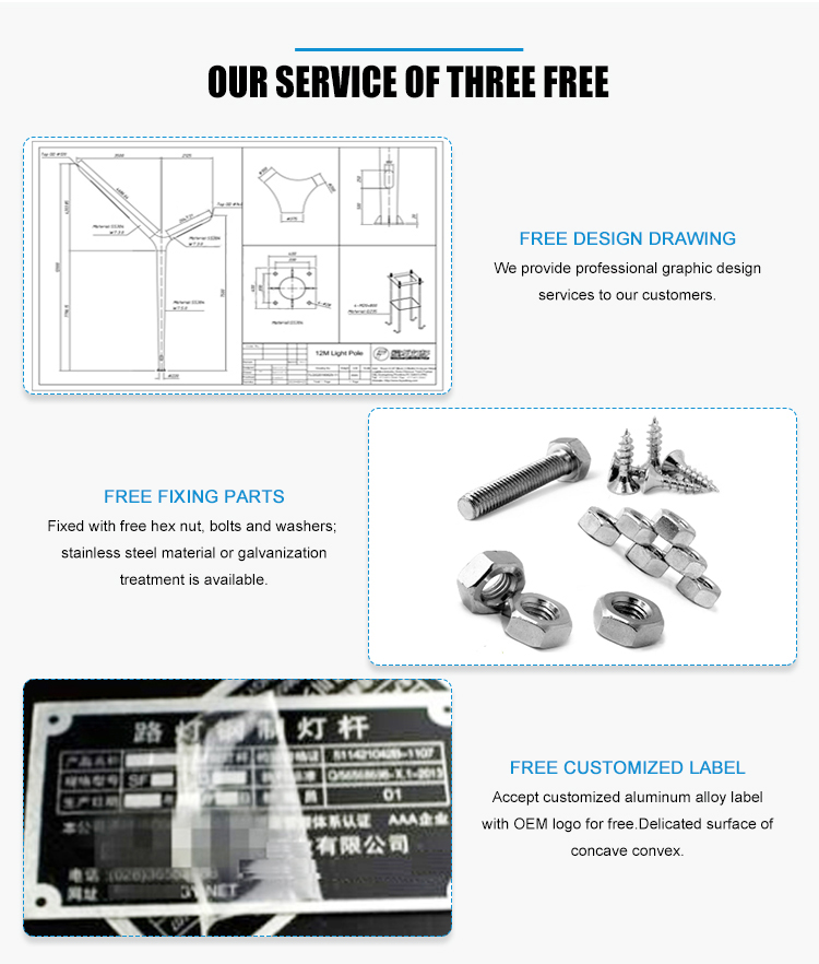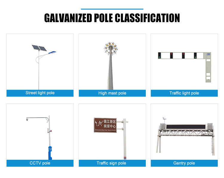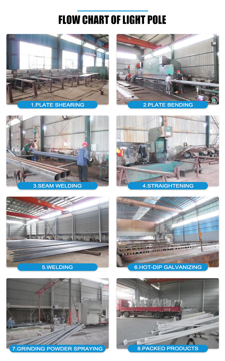♦ Manufacturing process: Light poles are integrally formed with smooth lines and hot-dip galvanized inside and outside. The galvanizing process includes pickling, hot-dip galvanizing, water washing, passivation, etc. Meet the national standard GB/T13912-92. Galvanized adhesion, meet the requirements of the standard GB2694-88, anti-corrosion life of more than 30 years.