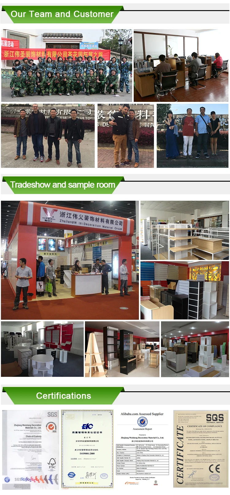 As a leader in store fixture and display industry, Zhejiang Weisheng Decoration Material Co.,Ltd is established in 2000 and now have already become expert in this business. We own 2 factories in Yiwu City and have over more than 50,000 m²plant. Our complete range of products include, Slatwall panels, Slatwall gondolas, Slatwall accessories, Showcases, Shop counters, wood fixtures, metal racks and extensive variety of customized store fixtures, etc.