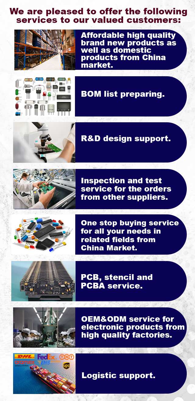 Our company is located at Huaqiang North where is the hearth of electronic component market in China. Our warehouse is located in Baoan District. We have wide range of our own inventory as well as we can easily access any kind of electronic products fast and we can provide cheap and high quality products to our customers.