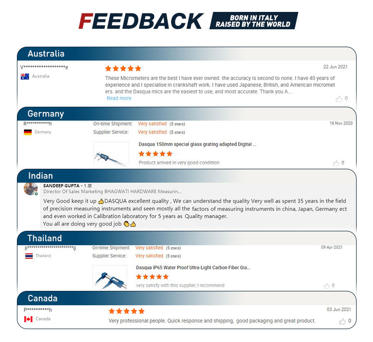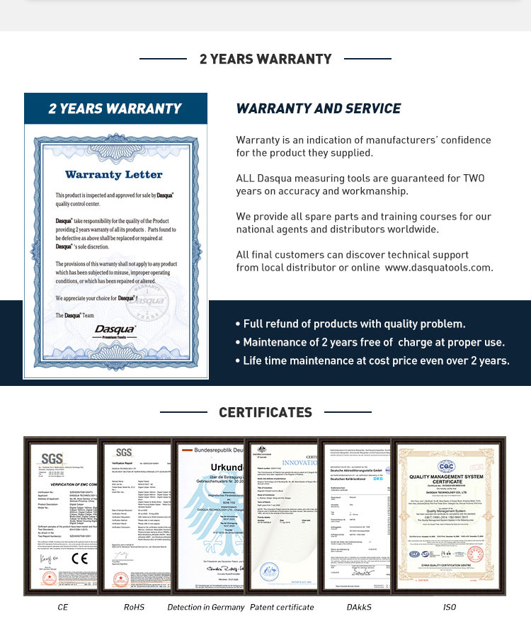 A: All DASQUA's measuring tools are made of high-quality materials and precision-machined to ensure product quality, withCalibration certificateandTwo-year warrantyLet you worry-free and guarantee your delivery time with efficient warehouse and logistics management.Worth the price and your trust!