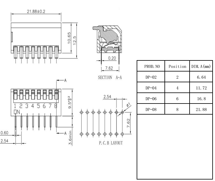 DP-04 2.54mm Piano Type DP Series Dip Switch spdt dip switch 4 pins named dp -4 with dip switch