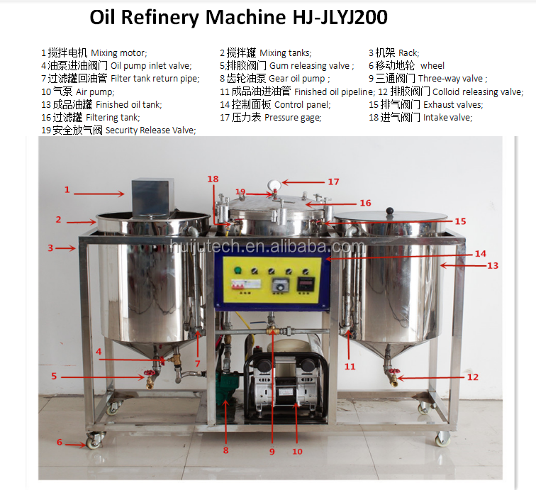 Model: HJ-JLYJ200 Refiner Machine size: 165*85*140cm Gross weight: 140kg Function: degumming, dephosphorization, decolorization With filter system, 75 kg per barrel, about 500 kg in 24 hours Voltage: heating power 4kw/220v/380v |