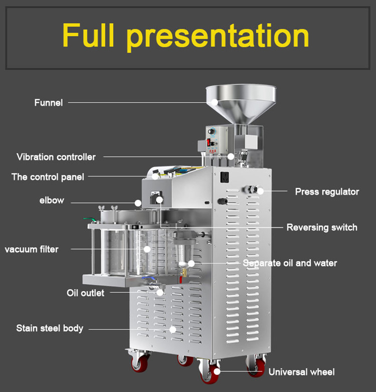 | Oil type: | Flaxseed Oil, Soybean Oil, Rapeseed Oil, Tea Seed Oil, Sesame Oil, Peanut Oil, Sunflower Oil, Almond Oil, Walnut Oil, Peanut Oil, Coconut Oil, Olive Oil, Palm Oil | Dimensions (L*W*H): | 650*670*1125 mm |