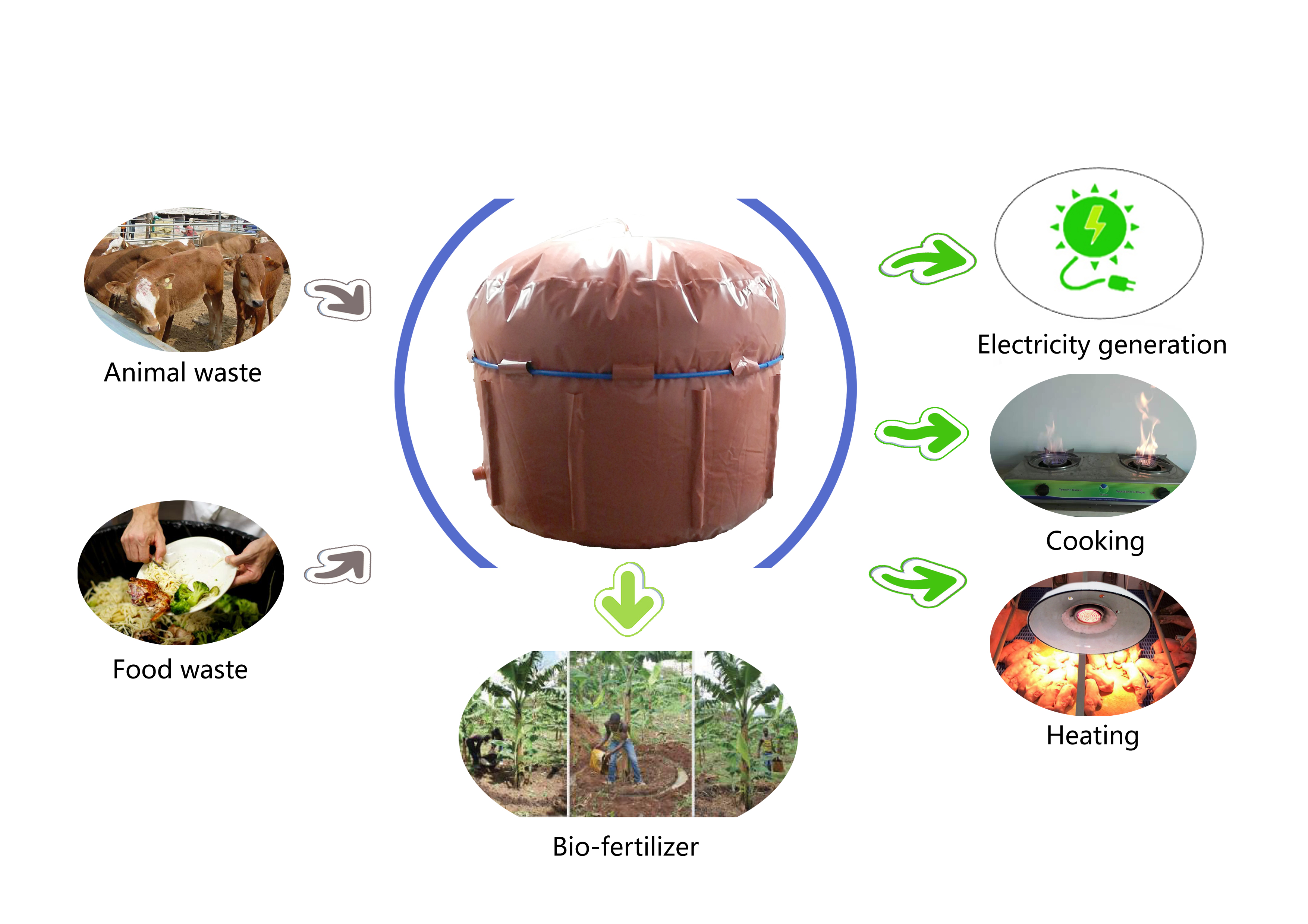 TEENWIN household soft digester is composed of membrane digestion bag and air storage bag.Stainless steel support frameThe inlet is used to add fermentation materials, the outlet is used to flow out the slurry, the biogas filter is used to clean the biogas, and the biogas pump provides pressure for the biogas furnace. The digestive bag is made of special materials, which have the characteristics of anti-aging, acid and alkali resistance, and UV protection. Biogas and bioslurry are the main products of biogas digesters. As a clean energy source, biogas can be used for cooking and lighting in the home, while bioslurry has multiple benefits in the agricultural field, and can be used as a valuable resource for household fertilization to increase crop yields.
