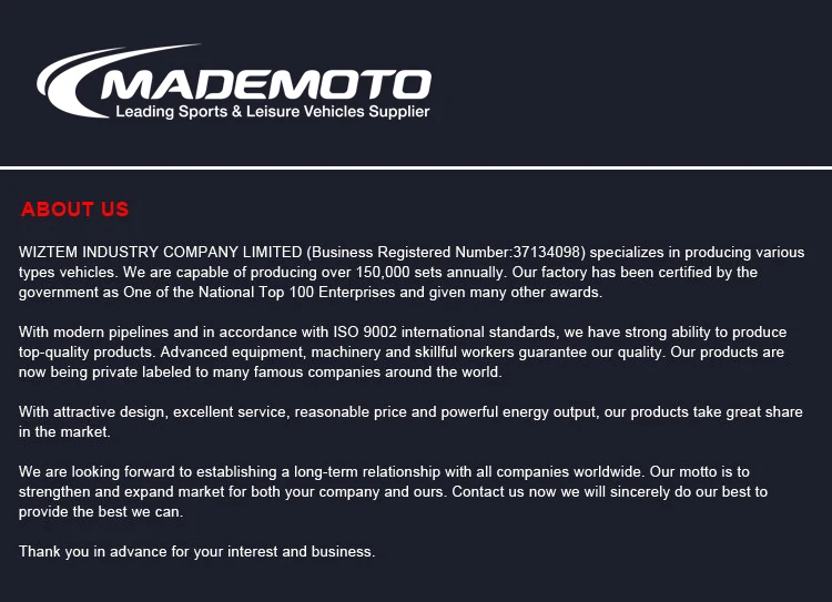 Wiztem Industry Company Limited was established in 2004. We specialize in various types of Leisure & Sport Vehicle developing and manufacturing. Our main products are Electric Scooter, Citycoco,ATVs, Go Karts, UTVs and other Sports & Fun Vehicles.