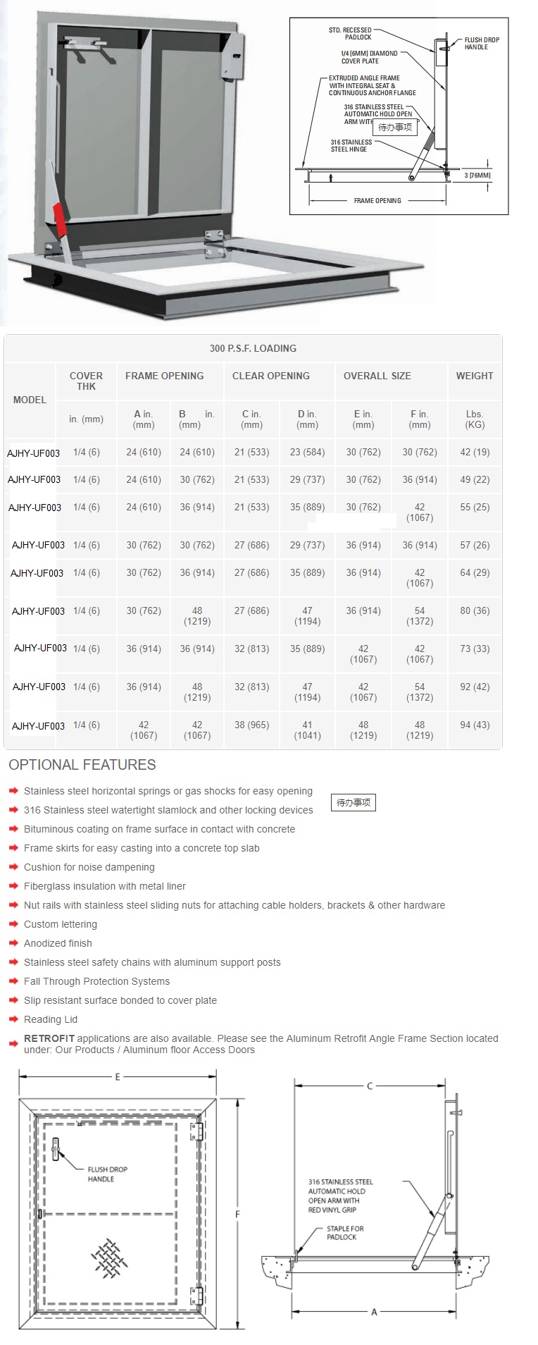Specification:The floor inspection door model is AJHY-UF001 produced by Anjia. Dimensions are specified in the plans. Door leaves shall be 1/4 inch thick diamond shaped aluminum plate capable of withstanding a live load of 300 psf. The frame shall be extruded aluminum with integral anchor flanges and door seats on all four sides. Floor access doors shall be equipped with a flush carrying handle that does not protrude above the lid, and 316 stainless steel spreader arms with red vinyl handles that automatically hold the lid in the upright open position. Doors shall have 316 stainless steel hinges and 316 stainless steel tamper resistant bolts/lock nuts. For security, padlock staples should be provided. Adhesive backed vinyl to protect the product during shipping and installation should cover the entire top of the frame and cover. Installation should be carried out in accordance with the manufacturer's accompanying instructions.