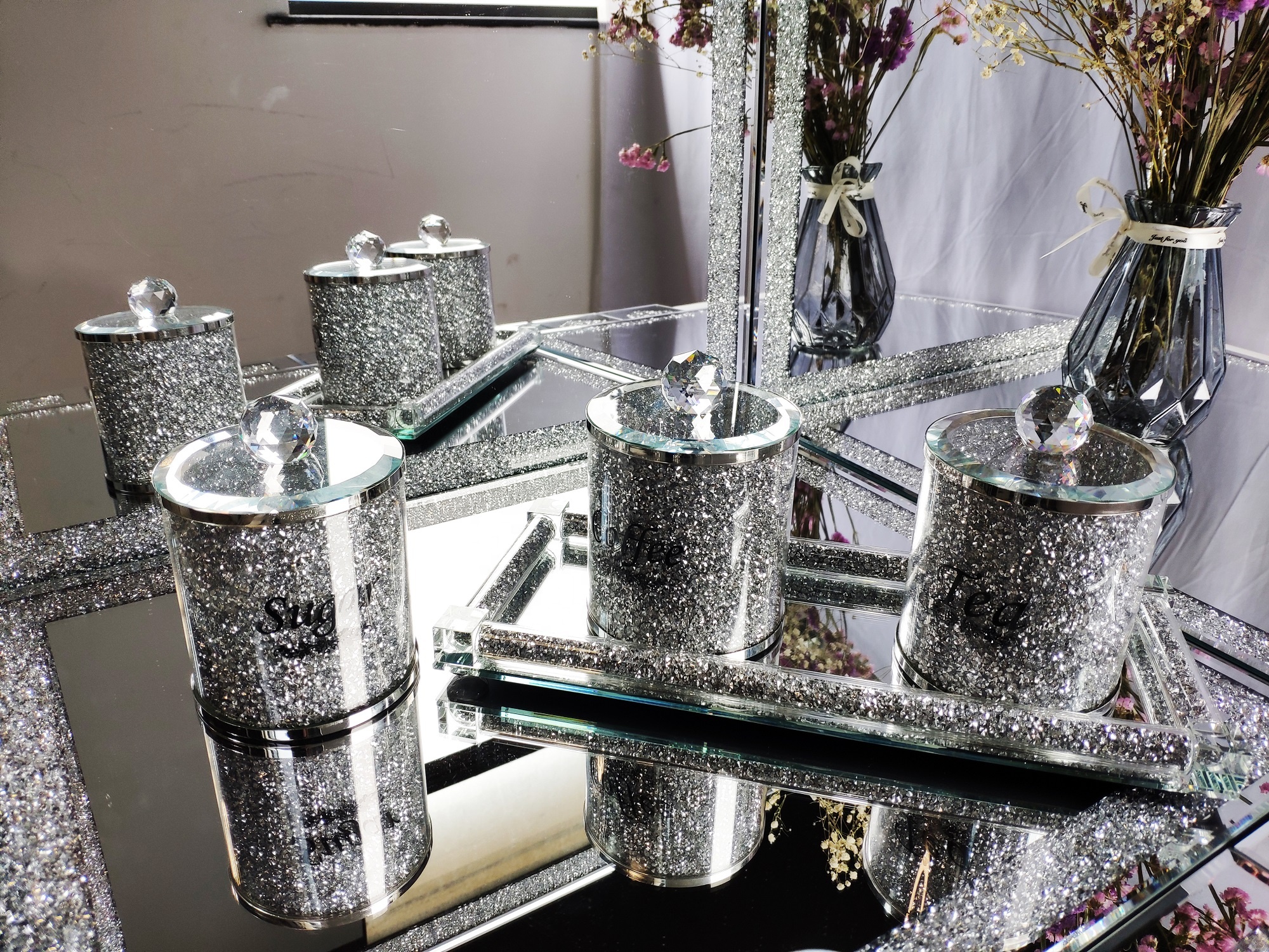 European style crystal glass coffee sugar tea jar set of four with tray crystal glass jar