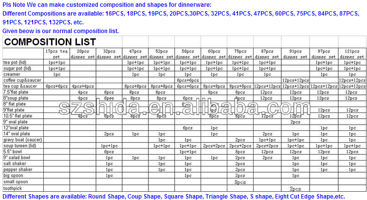 10.5 inch dinner plate*12 9 inch soup plate*12 8 inch dessert plate*12 180cc cup and saucer*12+12pcs |