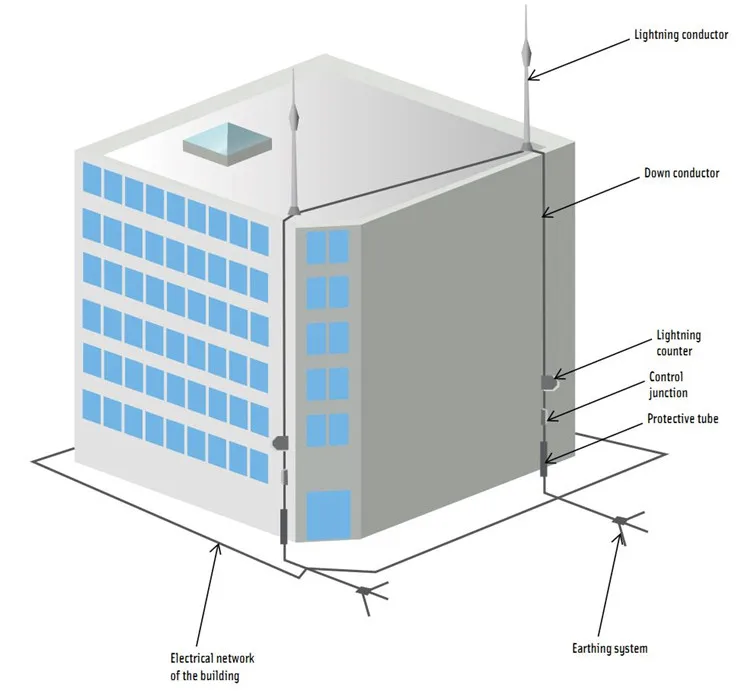 .The down conductor composed of one or several tin-ned copper tape with section in compliance with stan-dards in force,designed to flow the lightning current of the lightning conductor to the earthing system.This conductor will usually run outside the structure.Each fixing should allow an eventual conductor dilatation.Bend radius have to be inferior to 0.2 meters.Metalli-cal masses situated in the zone of separation calculated beforehand will be interconnected equipotentially to the lightning conductor.Each down conductor will be equipped at the bottom with a control junction and a 2 meter-high mechanical protective tube.