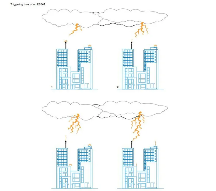 During a storm,when the propagation field conditions are favourable,the RY-SATELIT first generates an upward leader.This leader from the RY-SATELIT tip propagates towards the downward leader from the cloud at an average speed of 1 m/μs.The triggering time T(μs)is defined as the mean gain at the sparkover instant(continuous propagation of the upward leader)obtained with an ESE air terminal compared with a single rod air terminal exposed to the same conditions.T is measured in the high-voltage laboratory,all tests are defined in appendix C of the French standard NF C 17-102.