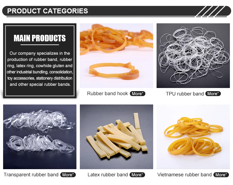 Our company specializes in the production of rubber band, rubber ring, latex ring, cowhide gluten and other industrial bundling, consolidation, toy accessories, stationery distribution and other special rubber bands. It is a manufacturing and processing enterprise forming development, production and sales. We specialize in developing different kinds of rubber band, rubber ring which included in various colors and quality. Our product also can be customized. At present, we have established a self-owned brand: Fuwei rubber band which features strong elasticity, high temperature resistance All of them meet EU environmental protection requirements. We also can provide SGS ROHS report, halogen-free report and other environmental certificates. Besides, we have quality assurance and can provide quality inspection report of quality By inspection bureau. We provide good service for more than 20 enterprises over 10 years.