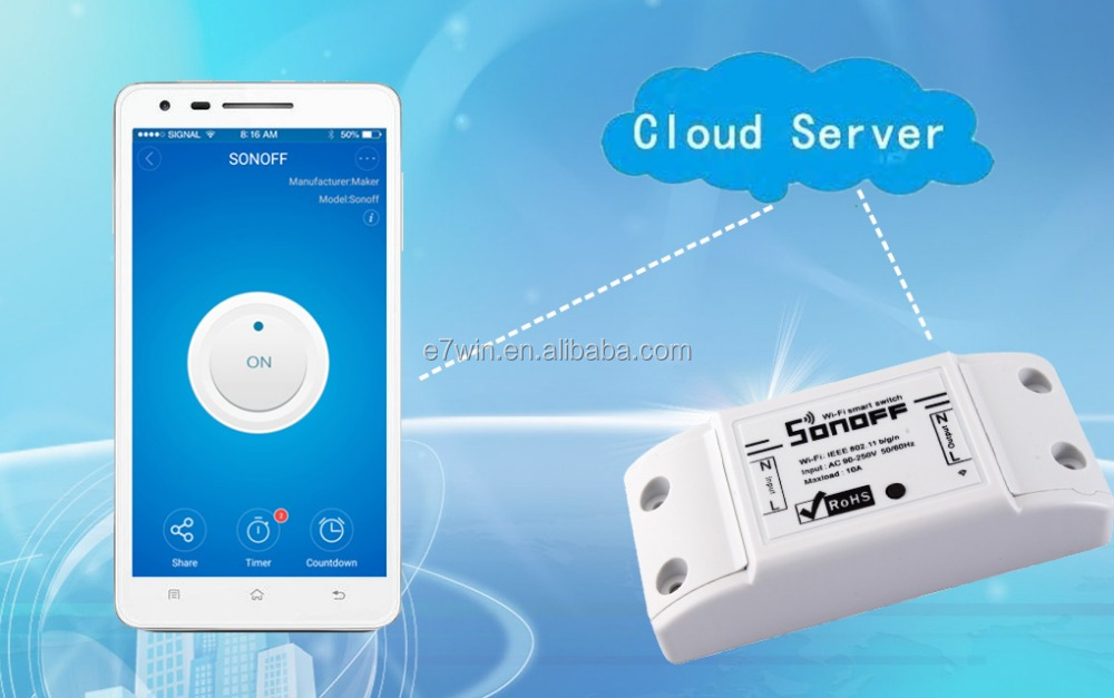 Sonoff is a WiFi wireless switch that can connect different types and brands of devices. Sonoff sends the data to the cloud platform through WiFi Router, allowing you to remotely control all home appliances through the App eWeLink on your smartphone.