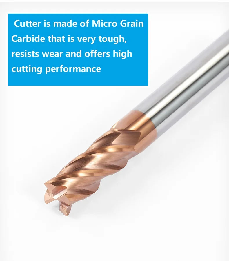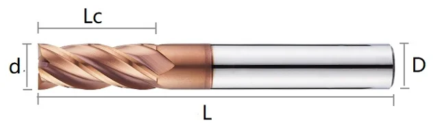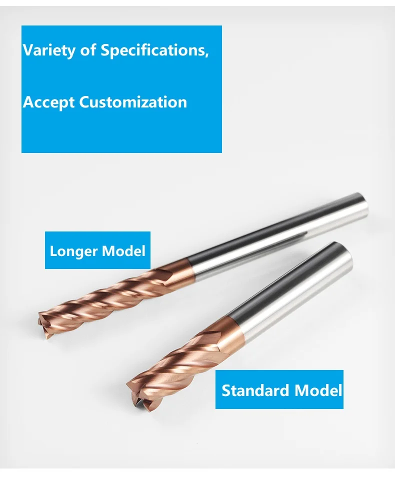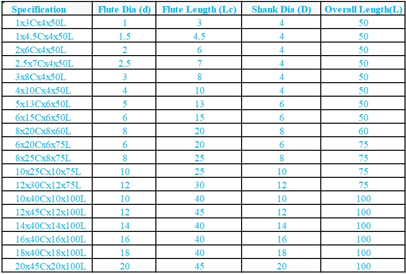 Tips: The list specifications are standard size. Meanwhile, we accept OEM customized production at diameter is 0.2mm to 25mm, the overall length is from 50mm to 200mm, include inch size end mill , the number of Flute is 2F, 3F, 4F and customized logo could be laser.
