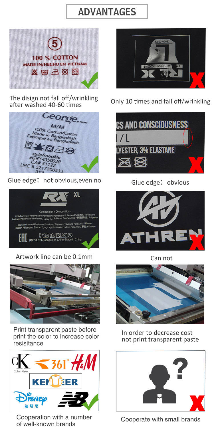 Tagless care labels are an alternative to traditional woven care labels. The tagless care labels are applied to cloth directly instead of being sewn in the garment like embroidered label. Most of garment manufactures prefer to tagless care label for their soft feeling without “itchy". Another reason is that there is no limited in colors for the labels.
