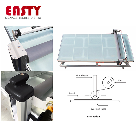 Pneumatically controlled roller which is automatically adjusted for substrates; Flatbed worktable with a uniquely designed self-healing cutting mat; Roll holder on glide beam for pre-masking tape and laminate.