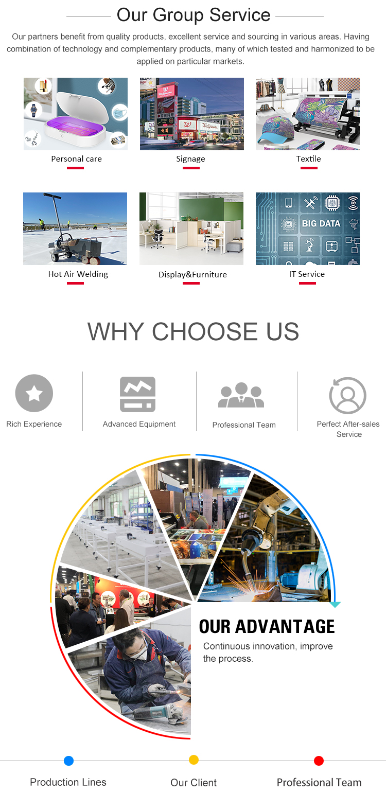 A: Our group offer wide ranges signage, textile & digital printing solution via Easty(www.eastyltd.com), offer welding & roofing equipment via JC Tool (www.jc-tool.com), offer medical & personal care products via Medwea(www.medwea.com).