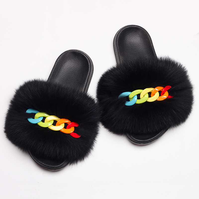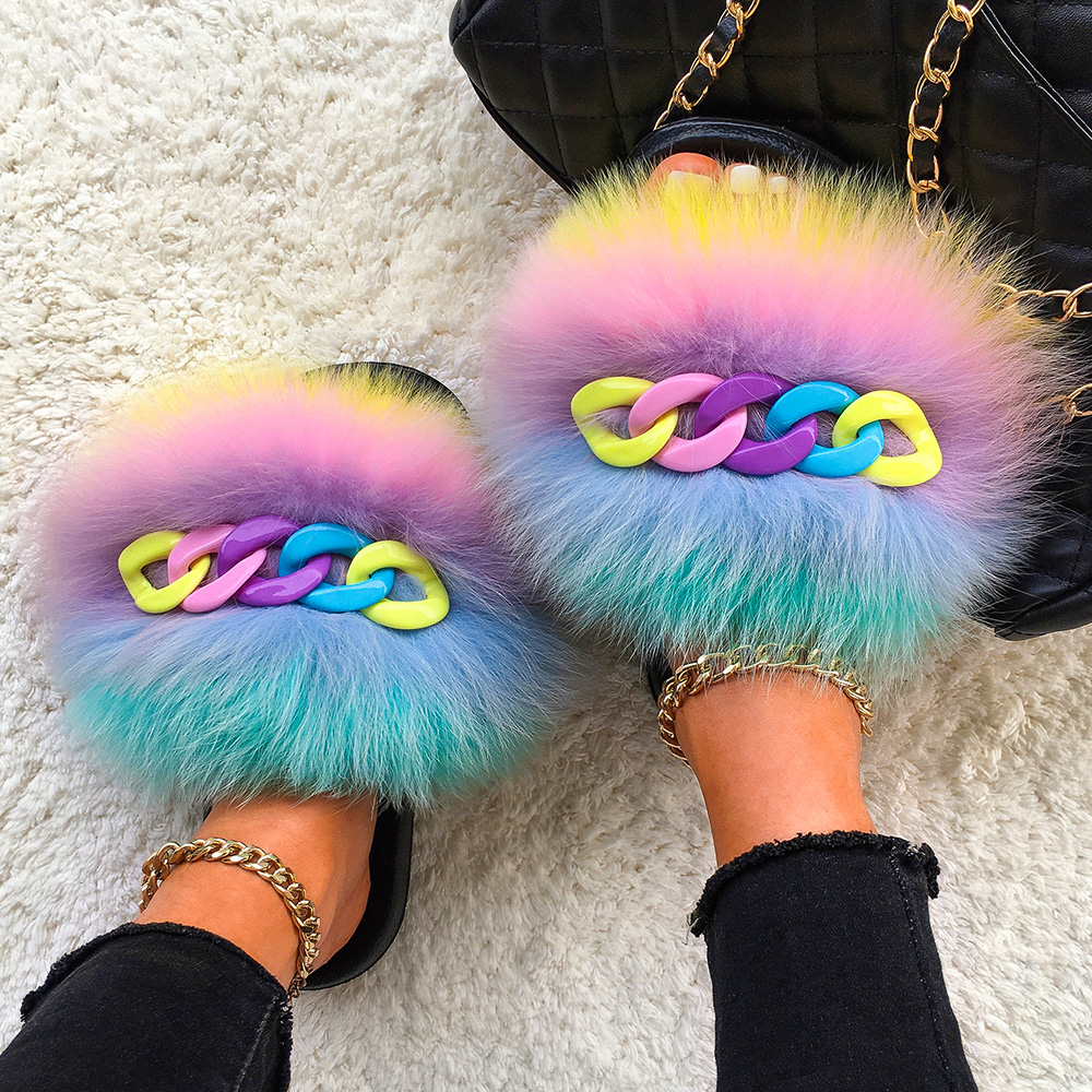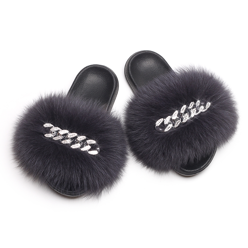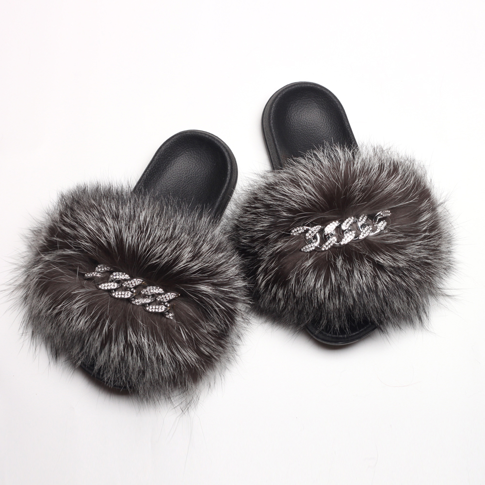 Fox Sandals Furry Fur Slippers Fluffy Flip-Flops Diamond Chain Leather Slippers Ladies Ladies Home Slippers Beach Flats