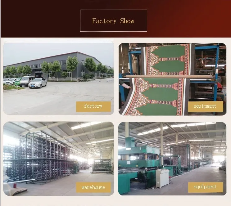 - Have supply full chain of carpet and relatived products, such as Pray mat, doormat, corridor carpet, car mat, room floor mat, ect., professional skill team and management guarantee high quality.
