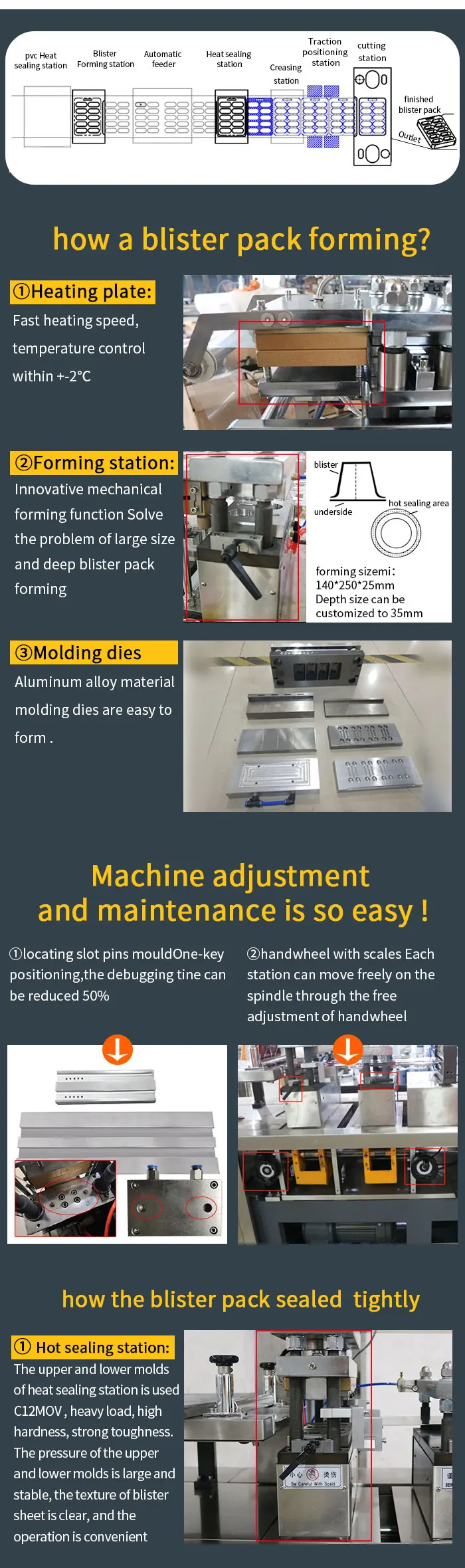 The flat plate automatic blister packing machine for liquid blistering pack has a large platform design, with a new type of the servo motor, PVC motor and for liquid blistering pack machine has helical gear reducer motor. Blister machine for liquid blistering pack has the four stations and an integrally the formed floor box, a mold drawing card slot design and the four pillars to fix for liquid blistering pack machine, and it for liquid blistering pack is equipped with the safety cover.