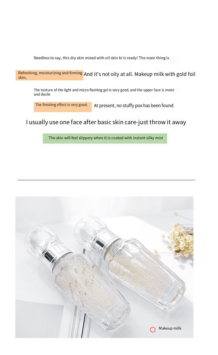 Pre-makeup emulsion makes the foundation not greasy at all. The makeup before the gold foil makeup is slightly luminous and the gel texture is very good. The upper face is moist and the finishing effect is very good. At present, no acne has been found. The skin will feel slippery .