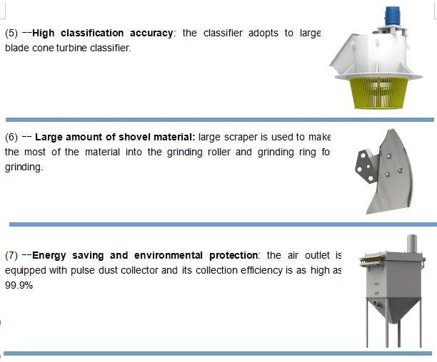 The mill is mainly used in glass, rubber, pesticide, enamel, paint,, papermaking and other chemical industries, and the material is non flammable and explosive materials with hardness below Mohs grade 7 and humidity below 6%. Such as: talc, barite, calcite, limestone, lime, manganese ore, iron ore, quartzite, gypsum, bentonite, etc. (the raw material is required to be 0-35mm, and the fineness of finished product can be adjusted between 80-400 mesh).