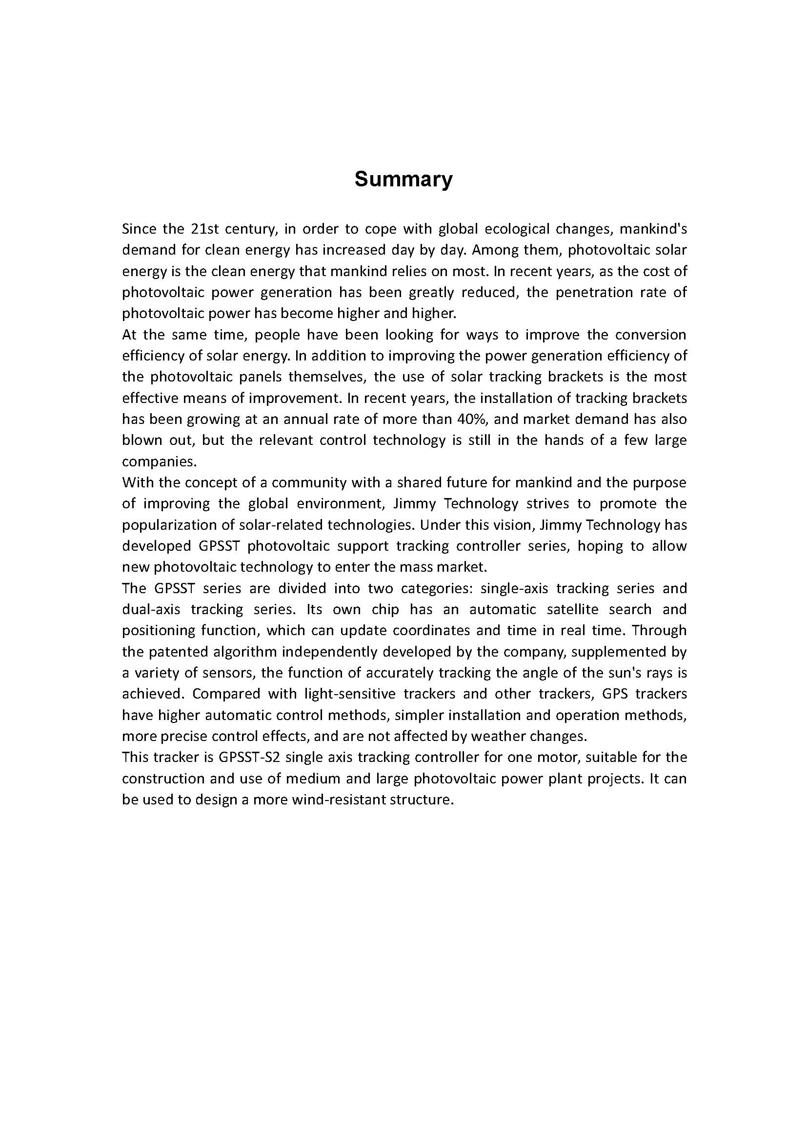 Based on the concept of a community with a shared future for mankind and the purpose of improving the global environment, Jimi Technology strives to promote the popularization of solar energy related technologies. Under such a vision, Jimi Technology has developed the GPSST photovoltaic support tracking controller series, hoping to bring new photovoltaic technologies into the mass market. GPSST series is divided into two categories: single-axis tracking series and dual-axis tracking series. The built-in chip has the function of automatic satellite search and positioning, which can update the coordinates and time in real time. Through the patented algorithm independently developed by the company, supplemented by a variety of sensors, the function of accurately tracking the angle of the sun's rays is realized. Compared with photosensitive trackers and other trackers, GPS trackers have higher automatic control methods, simpler installation and operation methods, more precise control effects, and are not affected by weather changes. This tracker is a GPSST-S2 dual-axis tracking controller, which is suitable for the construction and use of large and medium-sized photovoltaic power station projects. It can be used to design more wind-resistant structures.