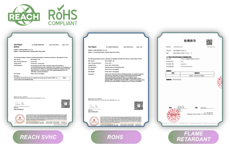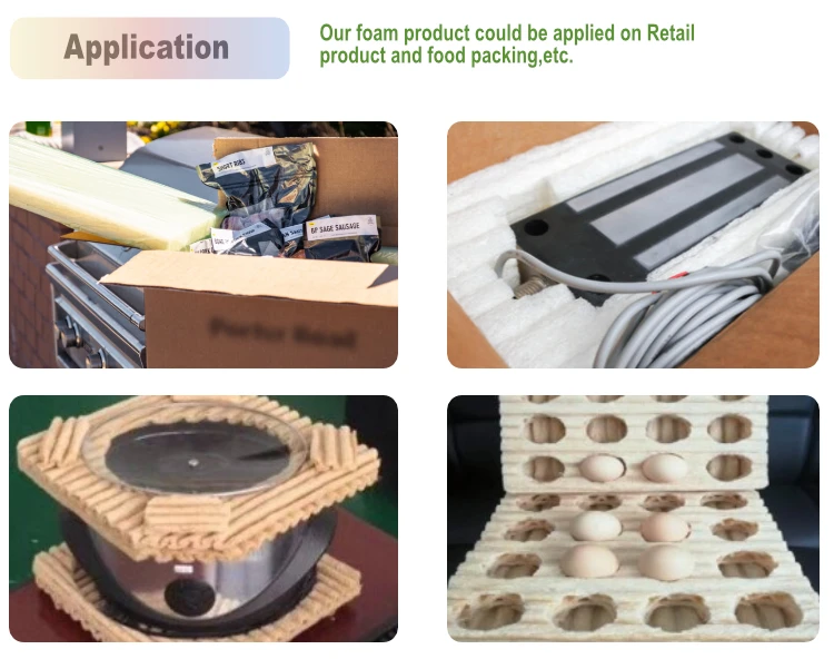 Our foam material could be widely used in food and retail product packing field which need more physical performance like shock absorption, easy to shape recovery and long using life and healthy/Environment protection.