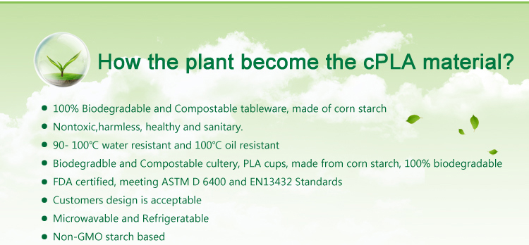 | Production: | CPLA Cutlery Packaging | Certification: | LFGB, BRC, BPI ASTM D6400; EN13432 BSCI MSDS |
