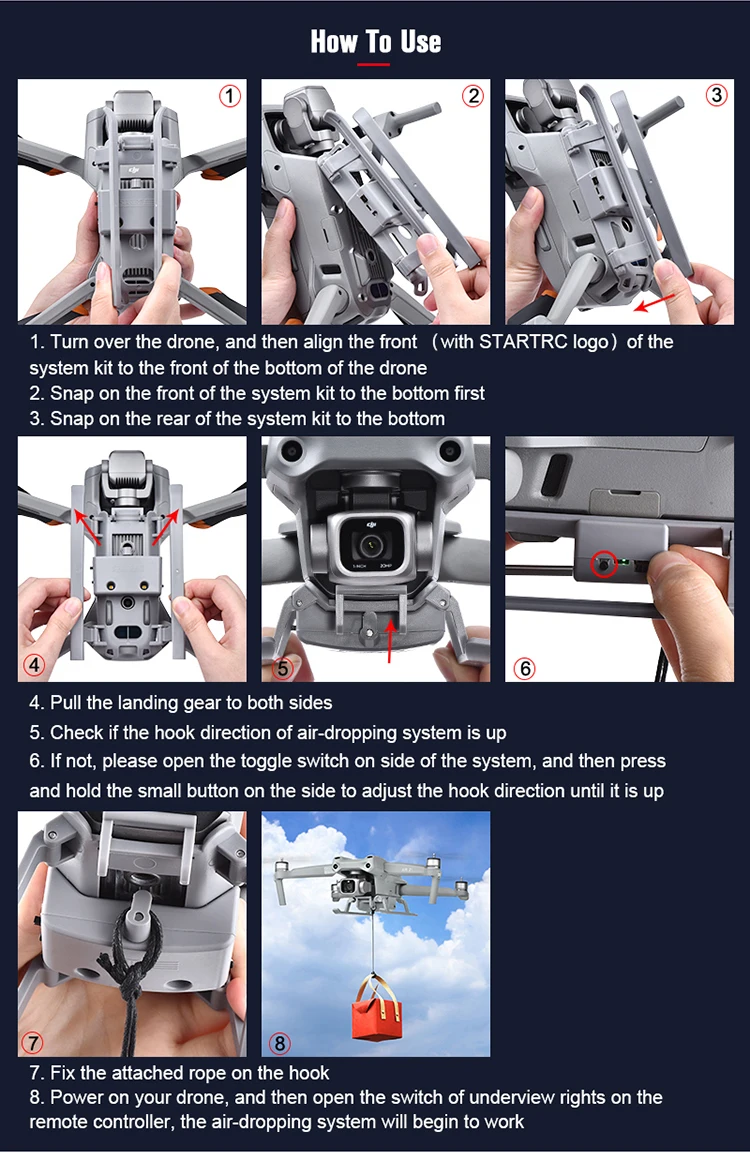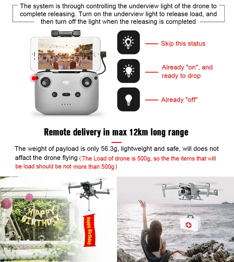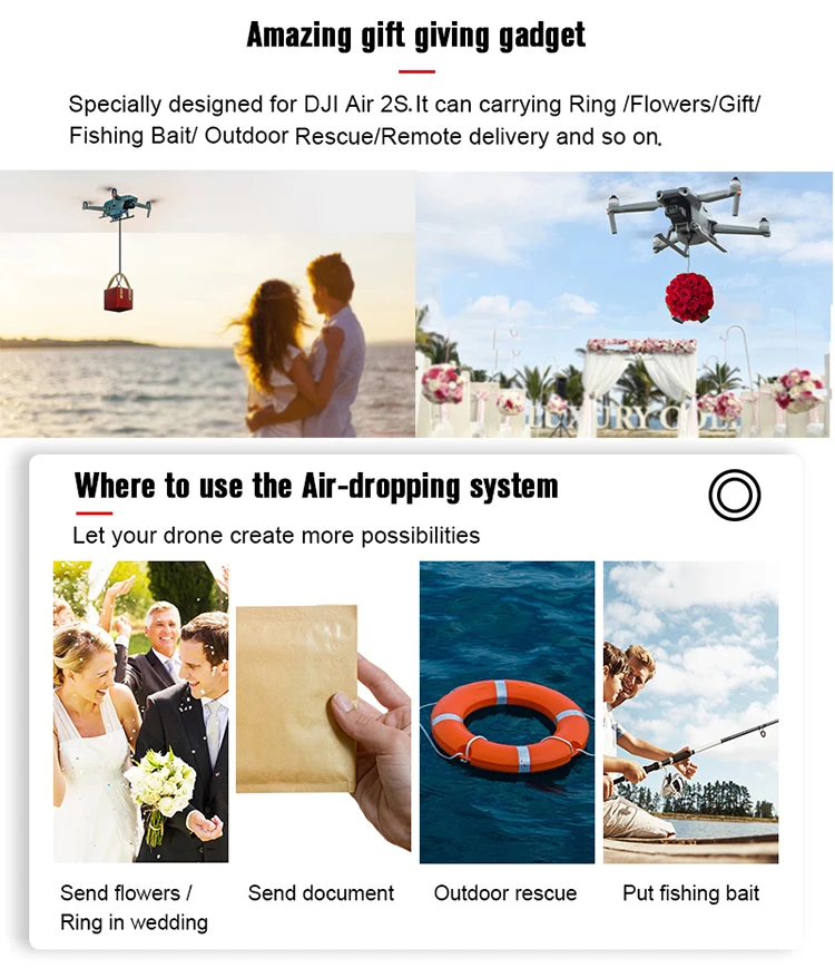The Airdrop system can be remotely delivered, for advertising, throw fishing bait, throw gifts, delivery meals, delivery wedding rings, etc;