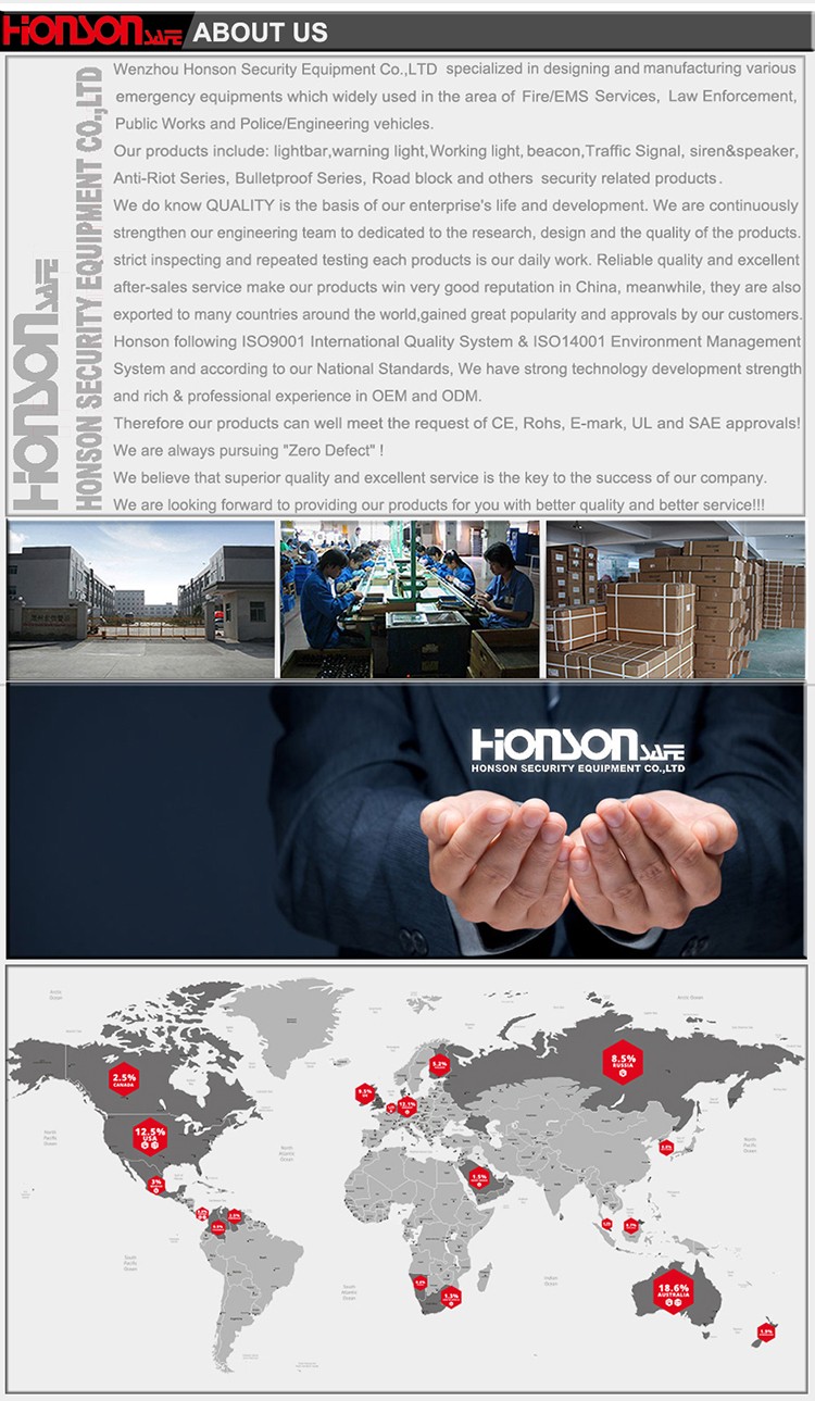 Our products include: Light Bars, Warning Lights, Work Lights, Beacons, Traffic Signal Lights, Sirens and Speakers, Anti-Riot Series, Bullet-Proof Series, Barricades and other Chinese safety-related products.