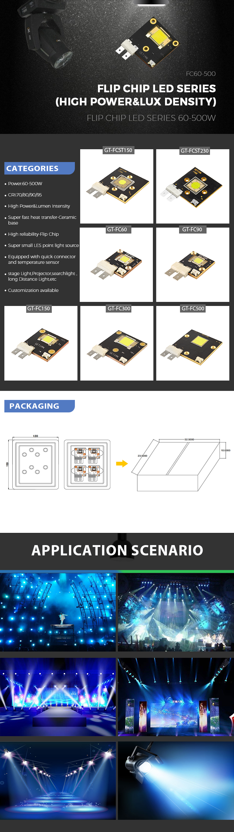 300W, 400W, 600W, 800W, 1000W, 1200W LEDs are used for long-distance projection, video mapping, dynamic effect projection, architectural projection.