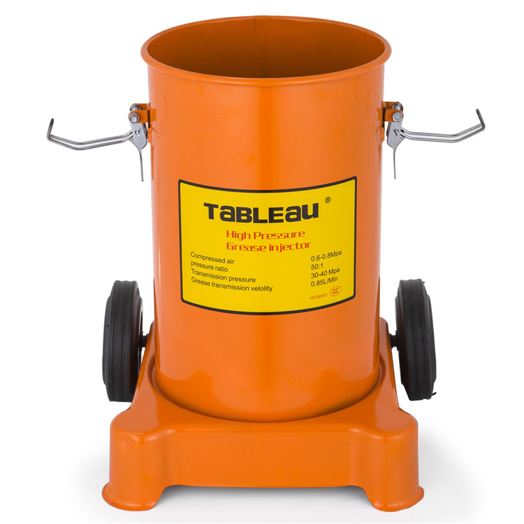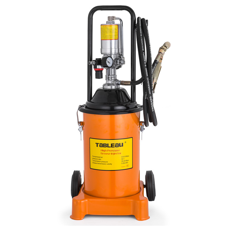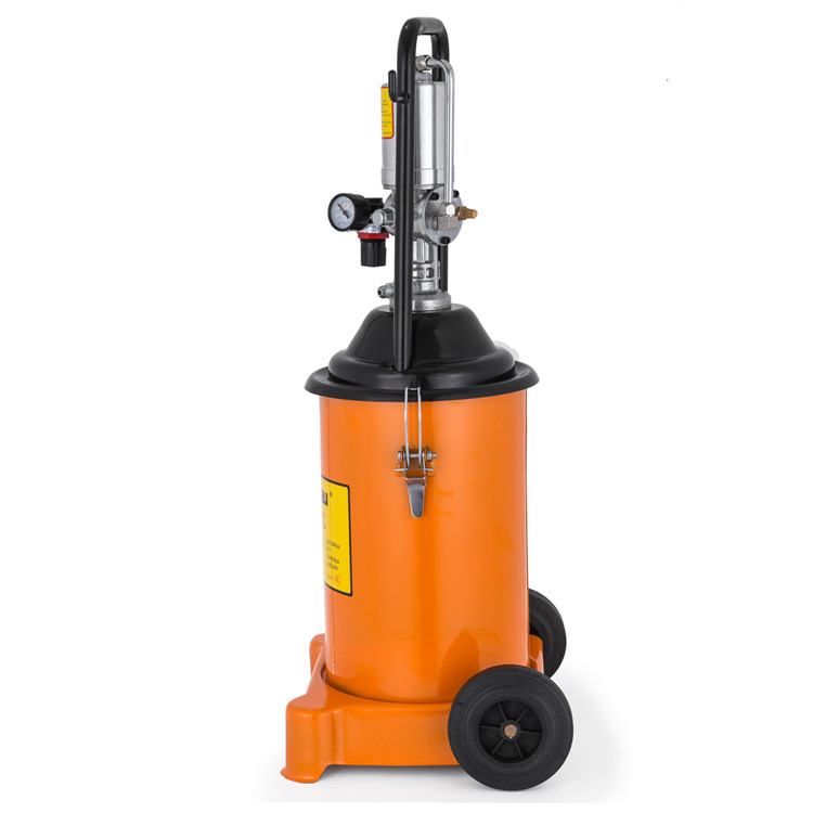 Listed are approximately 3 gallons (12 l) grease pumps. The grease pump is driven by compressed air. Featuring safety and reliability, low energy consumption, accurate working pressure, simple operation and high efficiency, our air-operated grease pumps are an essential tool for lubrication in the workshop, garage, plant or construction market. Equipped with an inverted U-shaped handle and two rollers, this air-operated grease pump is easy to operate and transport.