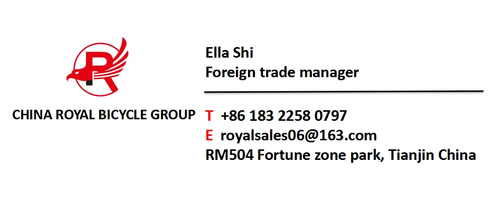China Royal Bicycle Group was established since 1998s and is a professional large-scale manufacturer of all types of bicycle and tricycle and electric bike, integrating development and production together. Our main products are bicycle, bicycle parts, tricycle, electric bicycle and related products. Our factory located in Wuqing District, Tianjin, China where is the basic of the bicycle industry. Currently, our bicycles are already exported to South America, Europe, Africa, Australia, USA and all of the world. Our company has always focused on research, development and innovation, and has recently developed new products. Welcome to visit our factory and book trial order with us!