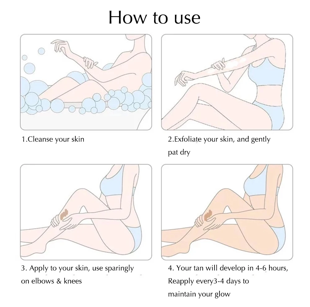 - Exfoliate 24 hrs before tanning. Moisturise dry areas such as hands, feet, knees, ankles and elbows prior to application.