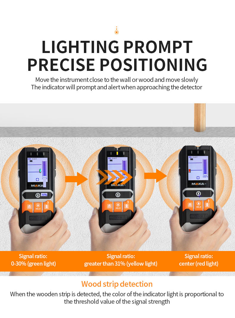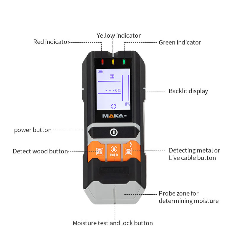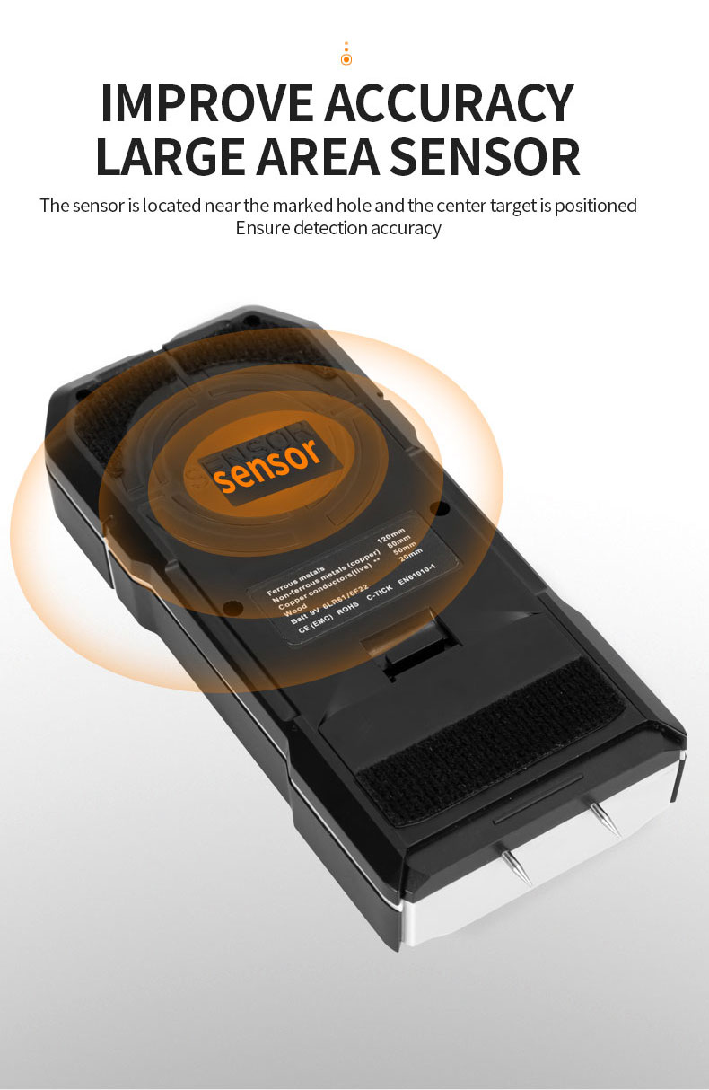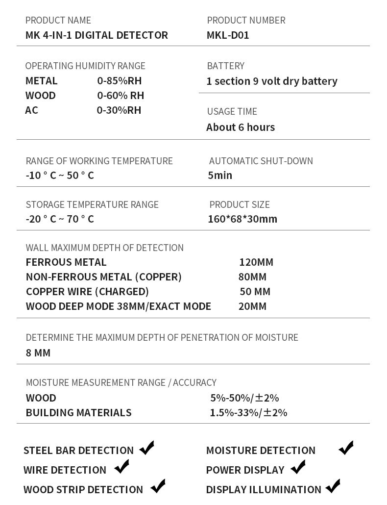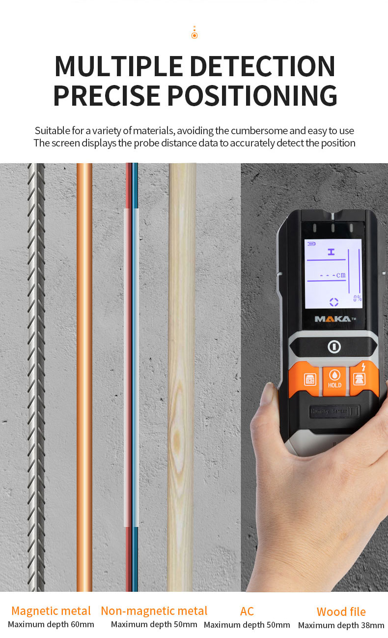 | application: | Wall Detector + Hygrometer, Wood, Drywall/Gypsum, Drywall, Wood Beams, Live Cables, Non-Ferrous Metals, Ferrous Metals | Wood Pattern: | Constant speed≤4cm/s |