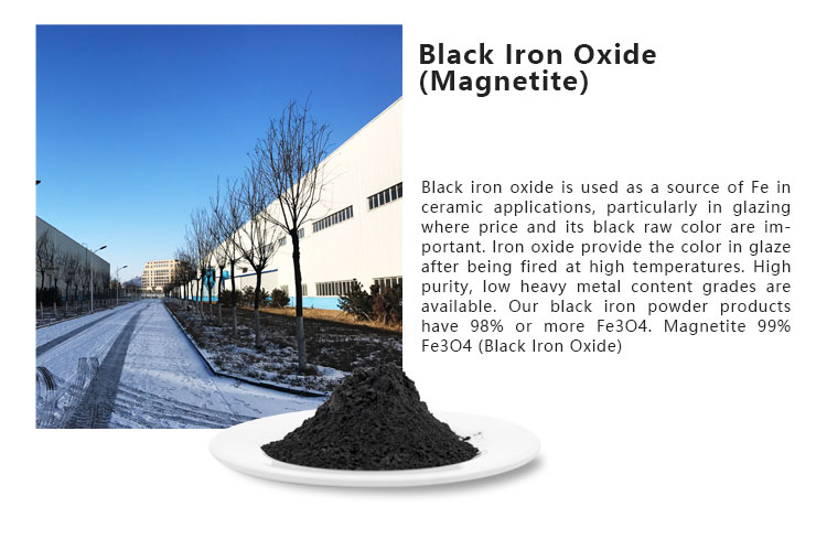 1. Black iron oxide is used as an iron source in ceramic applications, especially in glazes where price and black primary color are important. Iron oxide provides the color in the glaze after firing at high temperatures. High purity, low heavy metal content grades are available. Our black iron powder products contain 98% or more Fe3O4. Magnetite 99% Fe3O4 (black iron oxide)