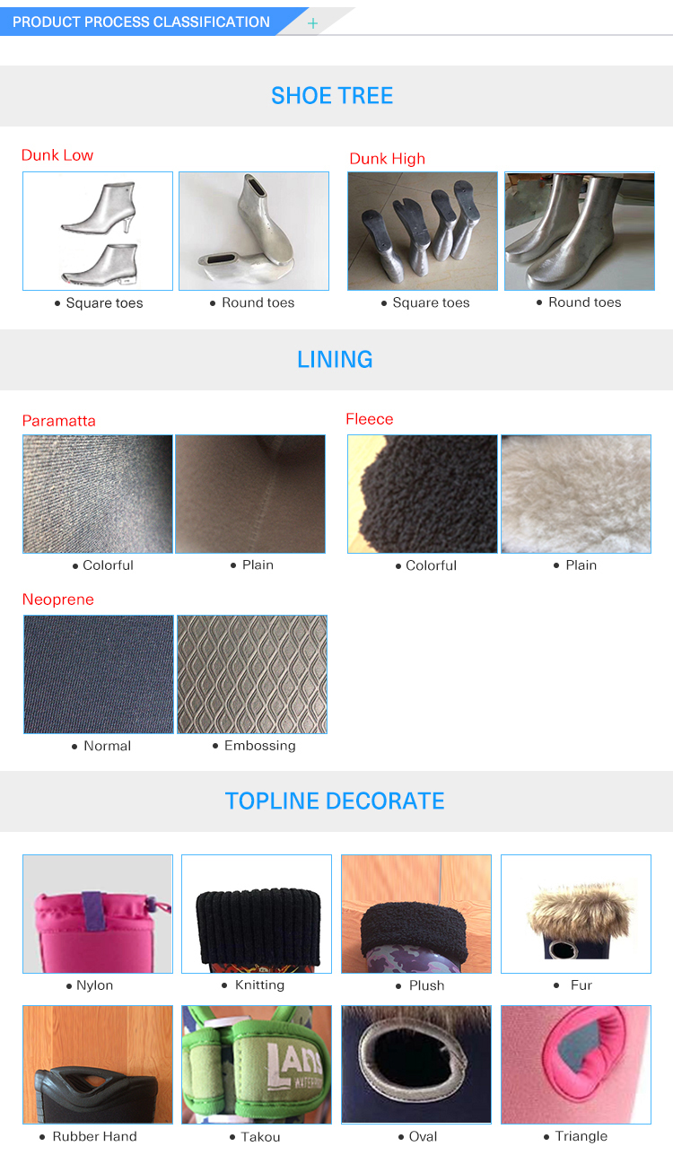 A: Our main products are snow boots, diving boots, rain boots and other waterproof material boots. Also, we have hunting clothes and other accessories.