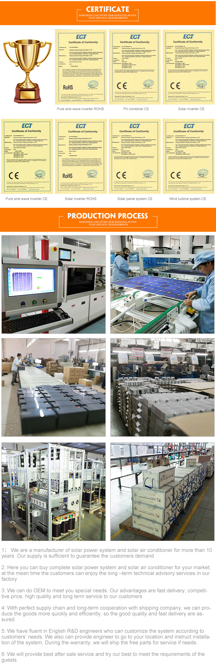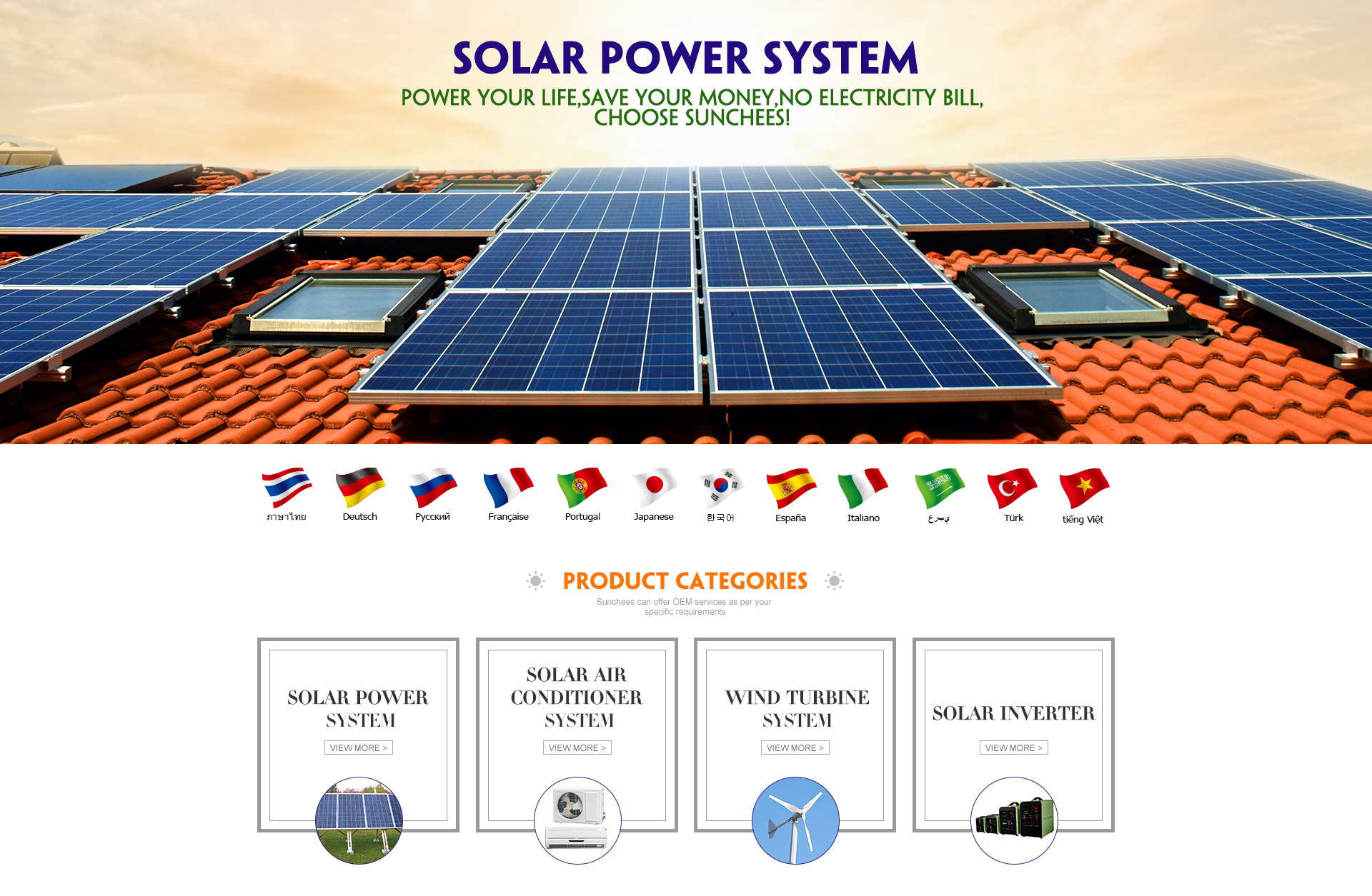 Foshan sunchees main products : Off grid solar power system , on/off grid hybrid solar power system , solar on grid system , wind and solar hybrid system , solar inverter , solar air conditioner system , solar street light system .