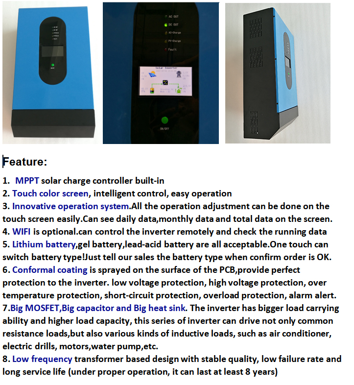 3) Solar hybrid inverter 2 years warranty , during the warranty time , any problems, we will DHL or Fedex new spare parts for change , it is free of charge for the shipping cost .
