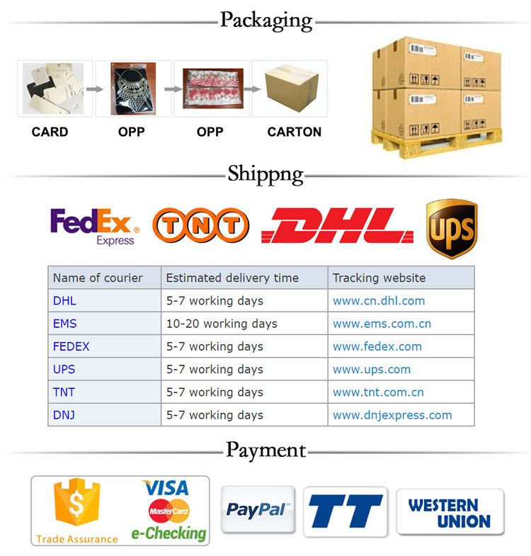 A : All our common packing is opp bag, 1pc/opp bag+card, 12pcs/opp bag, 50dozens/ctn (CBM:30CM*30CM*40CM). Also according to customer's request.