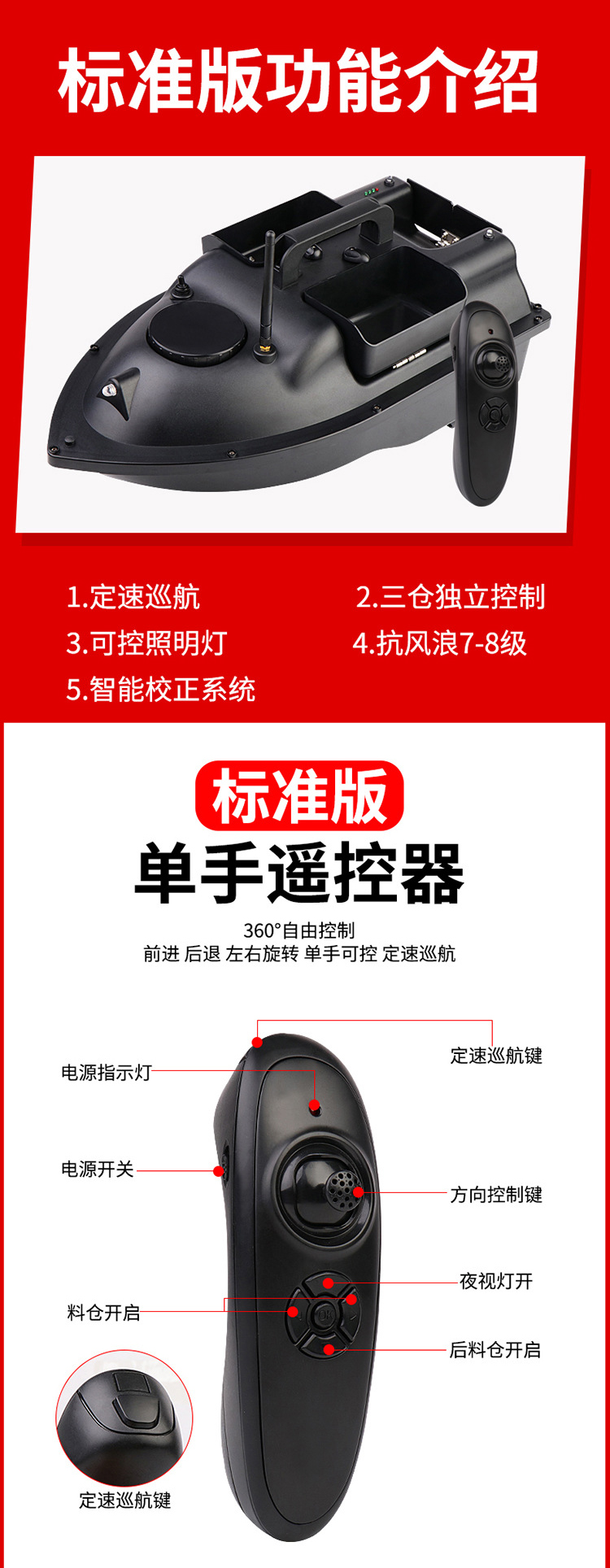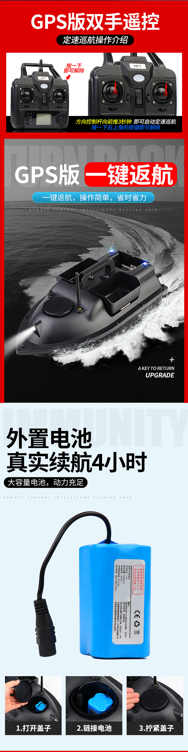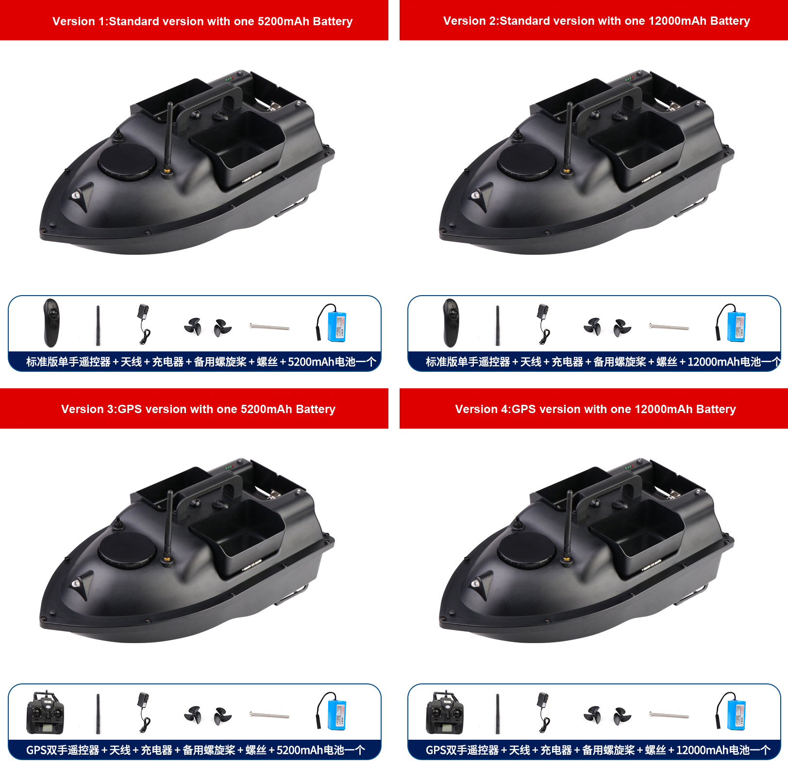 1. The standard version does not come with GPS: The standard version uses a one-handed remote control for cruise control. The remote control can control the night vision light from a distance. The three cabins can be controlled and opened independently, and the hull charging indicator light! The battery is 7.4V 5200mA and can be used continuously for about 2 hours.