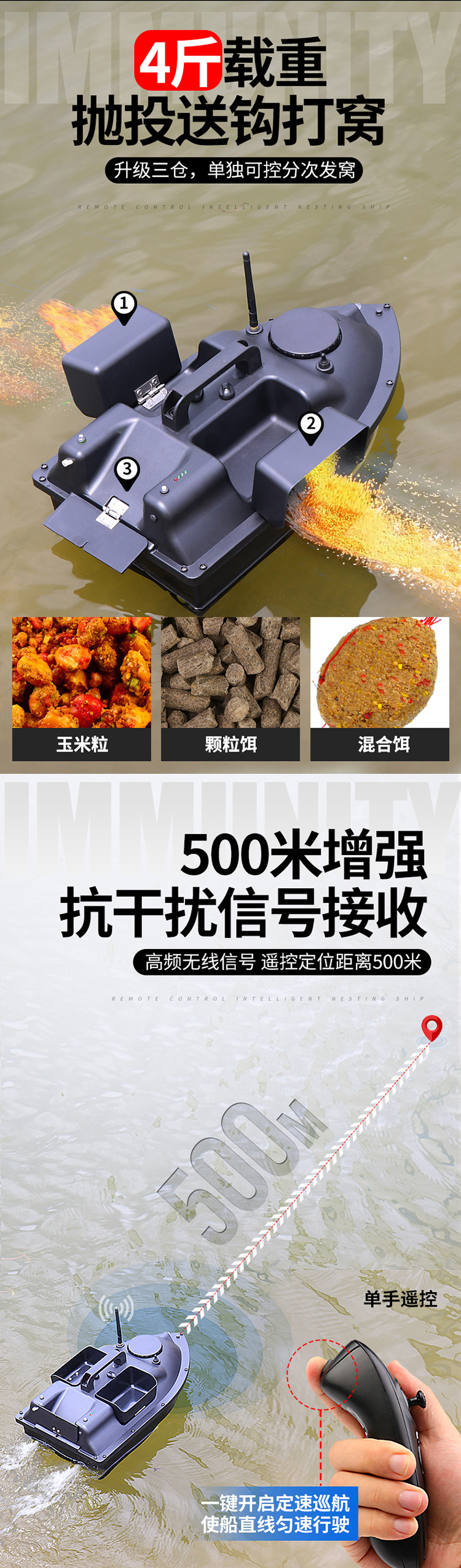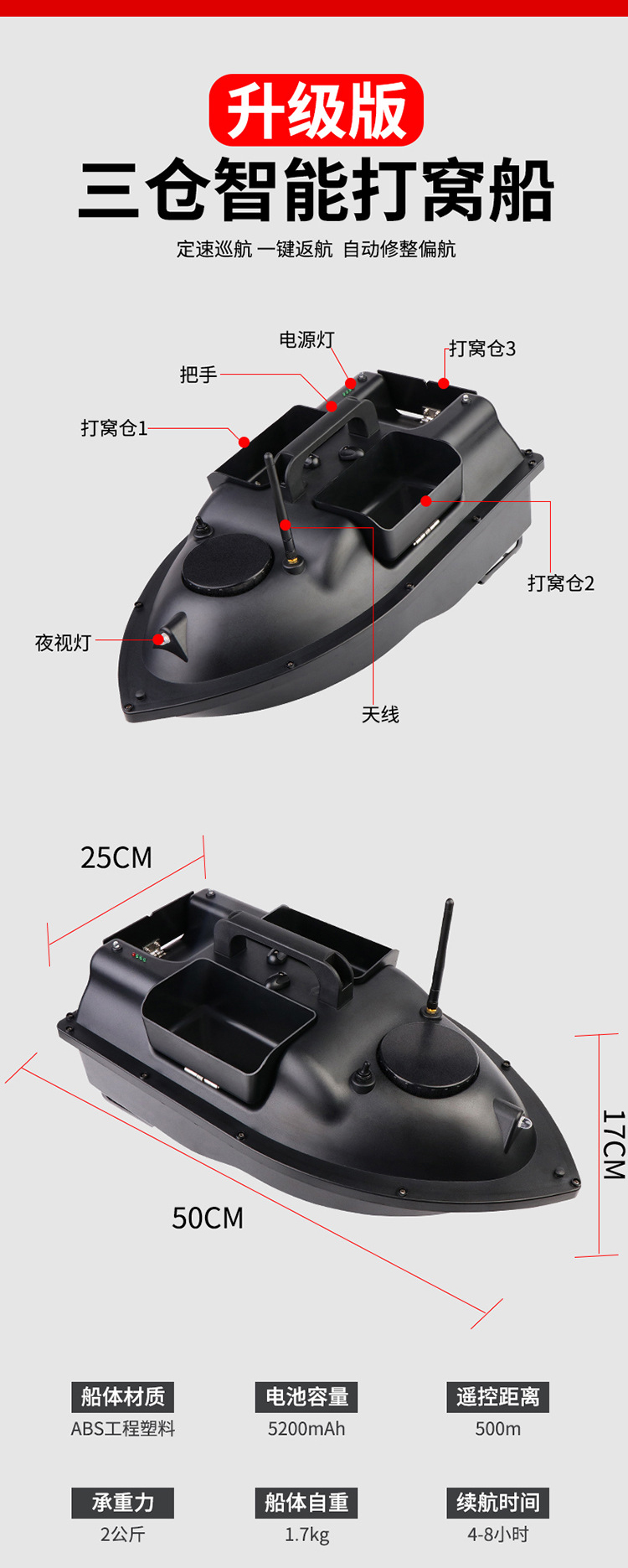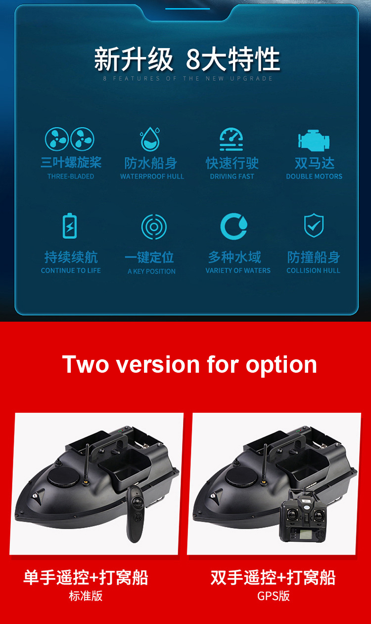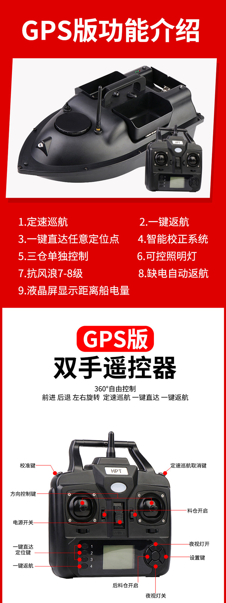 1. The standard version does not come with GPS: The standard version uses a one-handed remote control for cruise control. The remote control can control the night vision light from a distance. The three cabins can be controlled and opened independently, and the hull charging indicator light! The battery is 7.4V 5200mA and can be used continuously for about 2 hours.